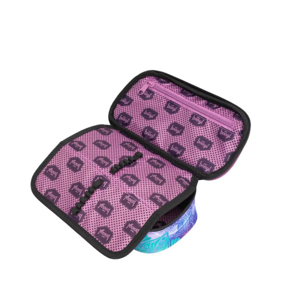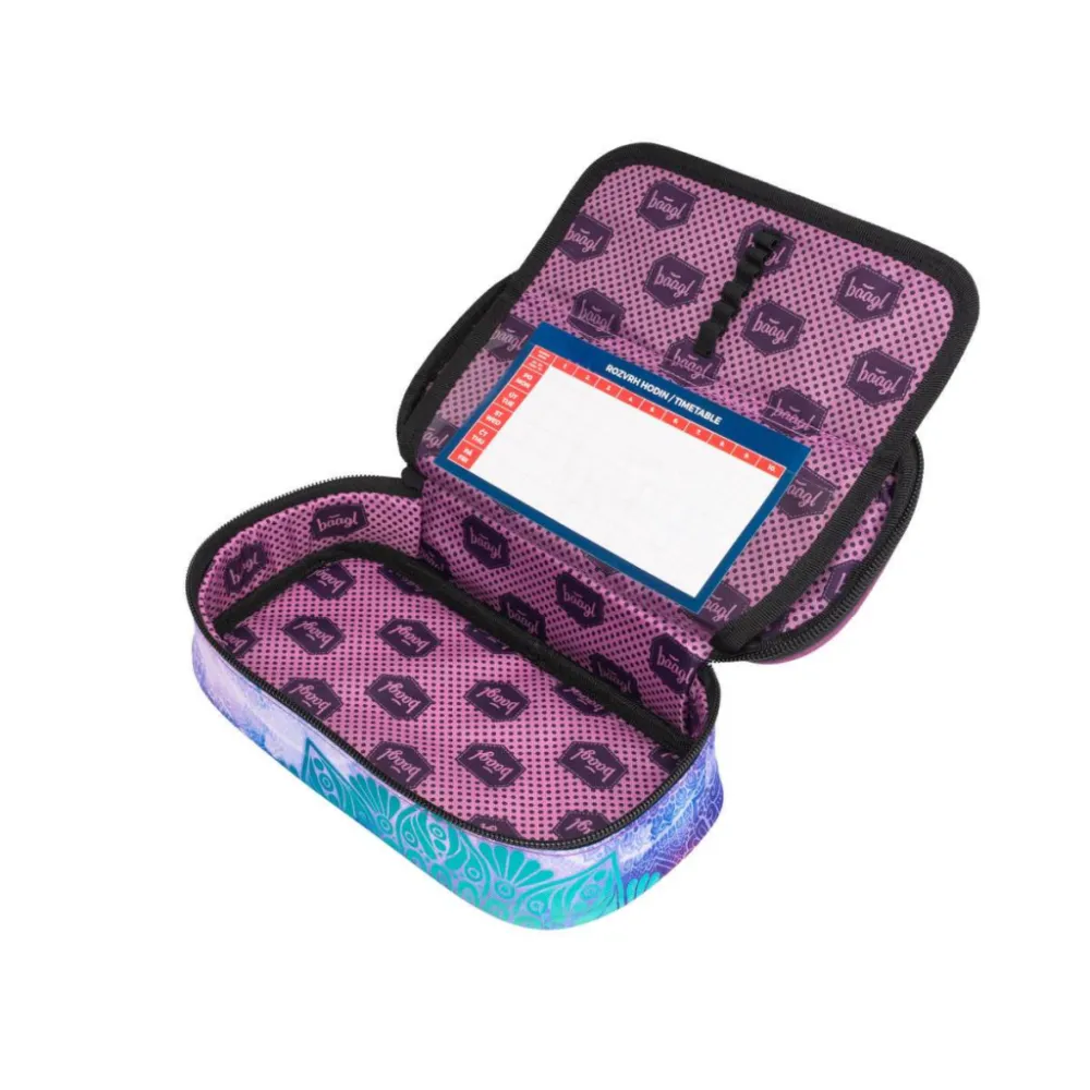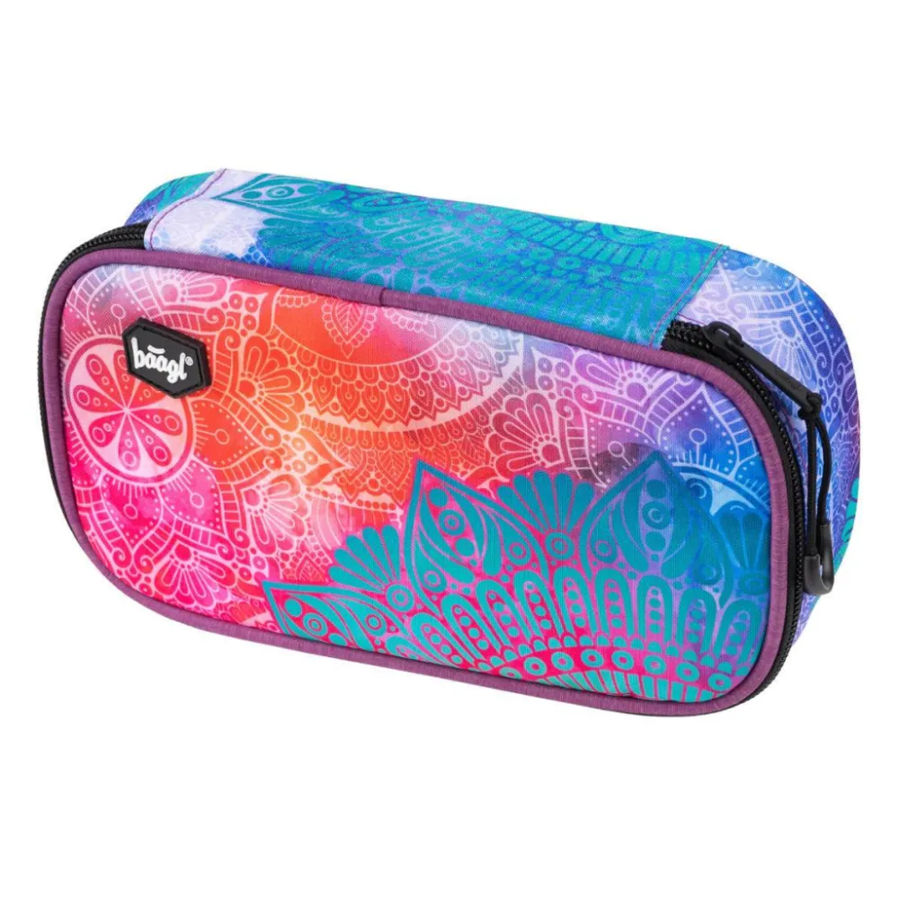• Pevný penál na zip s dvojitou výklopnou chlopní a potiskem mandal.