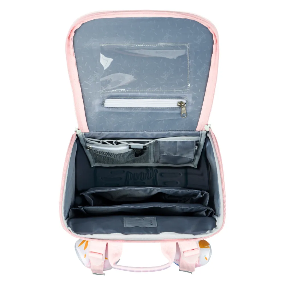 • Uvnitř aktovky je průhledná kapsa na rozvrh a vnitřní organizér umožňující rovnoměrné rozložení hmotnosti, doplněný gumičkou pro fixaci.