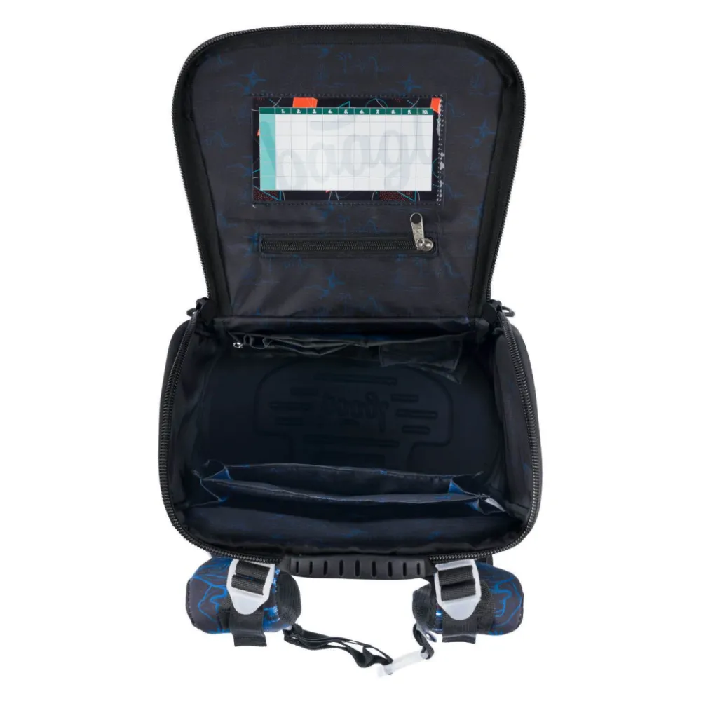 • Uvnitř aktovky je průhledná kapsa s rozvrhem a vnitřní organizér umožňující rovnoměrné rozložení hmotnosti, doplněný gumičkou pro fixaci.