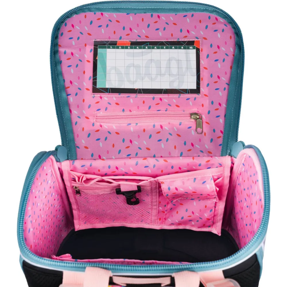 • Uvnitř aktovky je průhledná kapsa s rozvrhem a vnitřní organizér umožňující rovnoměrné rozložení hmotnosti, doplněný gumičkou pro fixaci.