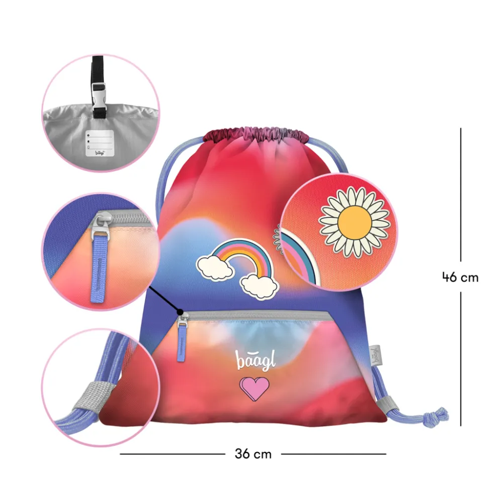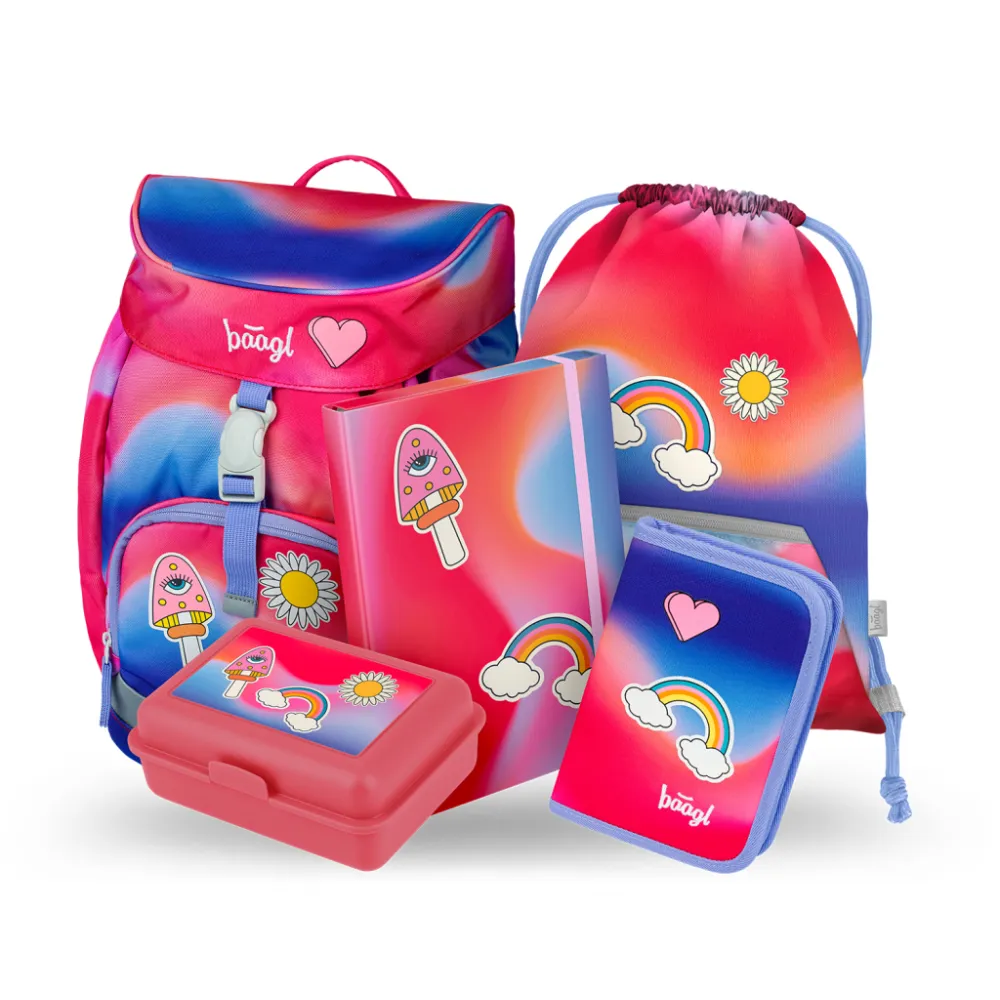 Detailní popis: BAAGL 5 SET Airy Duha červený: batoh, penál, sáček, desky, box