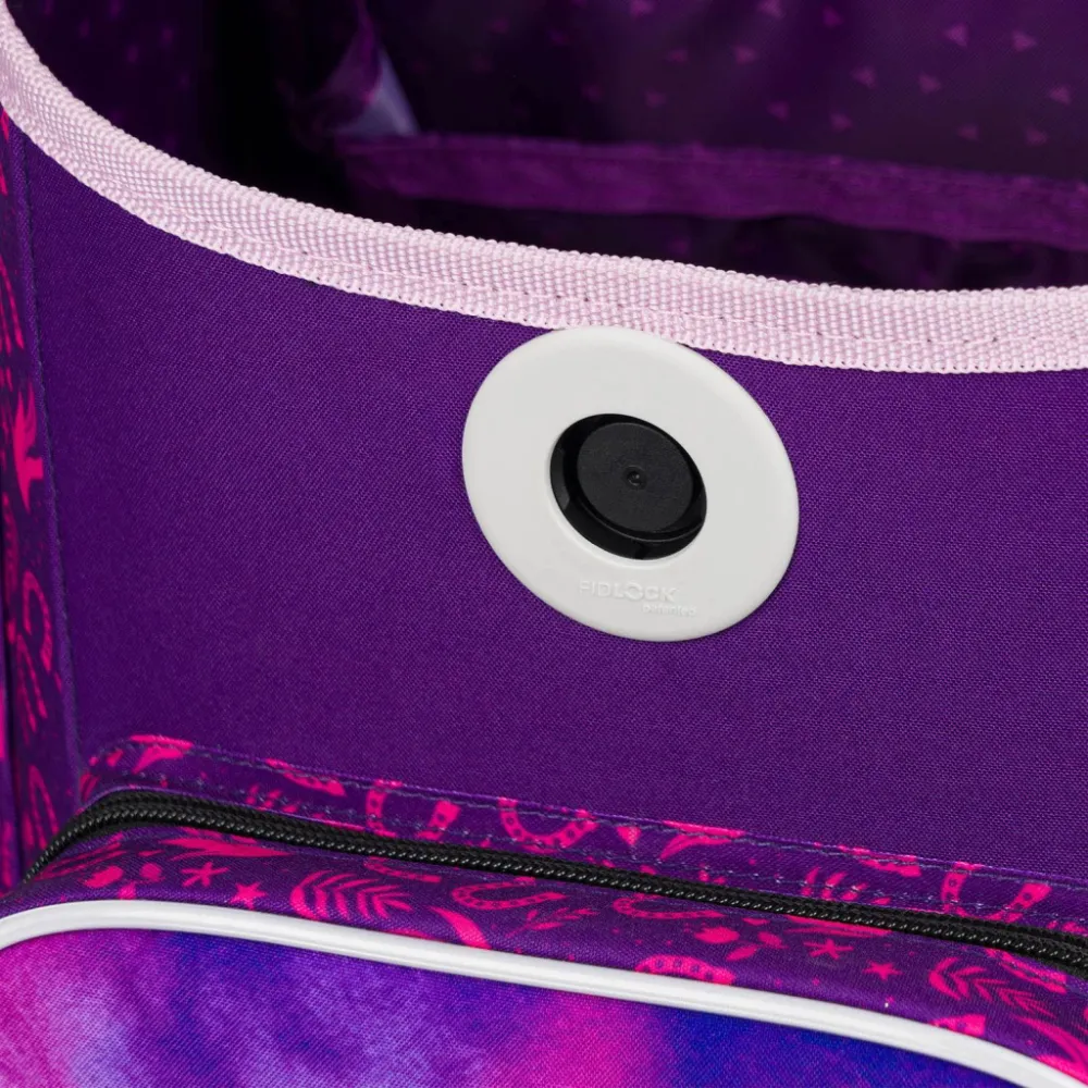 magnetické zapínání Fidlock k otevření aktovky postačí pouhé otočení přezky a uzavření aktovky probíhá díky magnetickému systému automaticky, bez nutnosti manuálního zapínání.