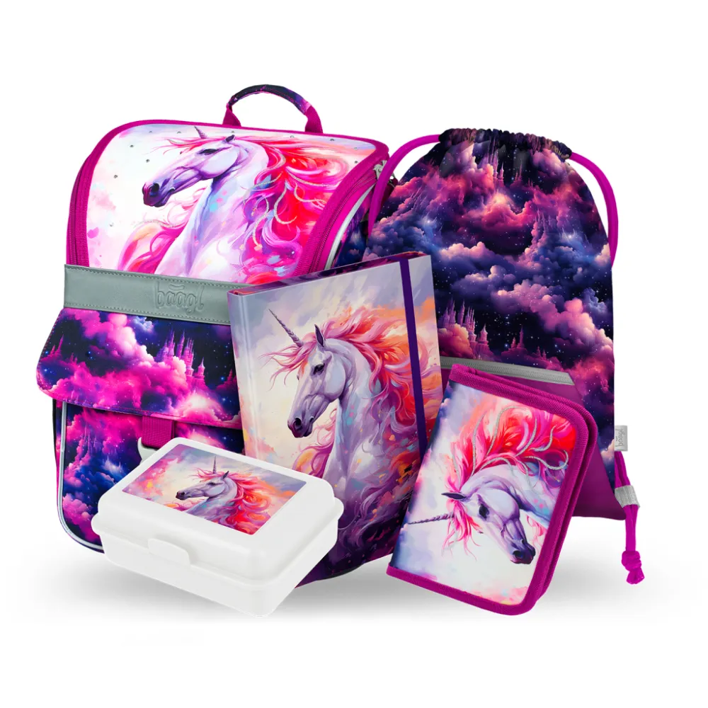 Detailní popis: BAAGL 5 SET Zippy Jednorožec Království: aktovka, penál, sáček, desky, box