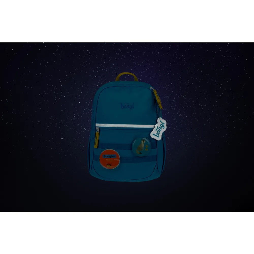 Modrý ergonomický batůžek Buddy s patchí s motivem vlka, reflexním přívěskem a vyměnitelnými odznáčky, které umožňují upravit jeho design, je vhodný pro děti od tří let.