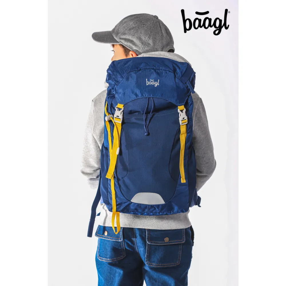 Modrý outdoorový batoh Tracker s logem BAAGL a žlutými popruhy je skvělou volbou na výlety, turistiku i do školy.