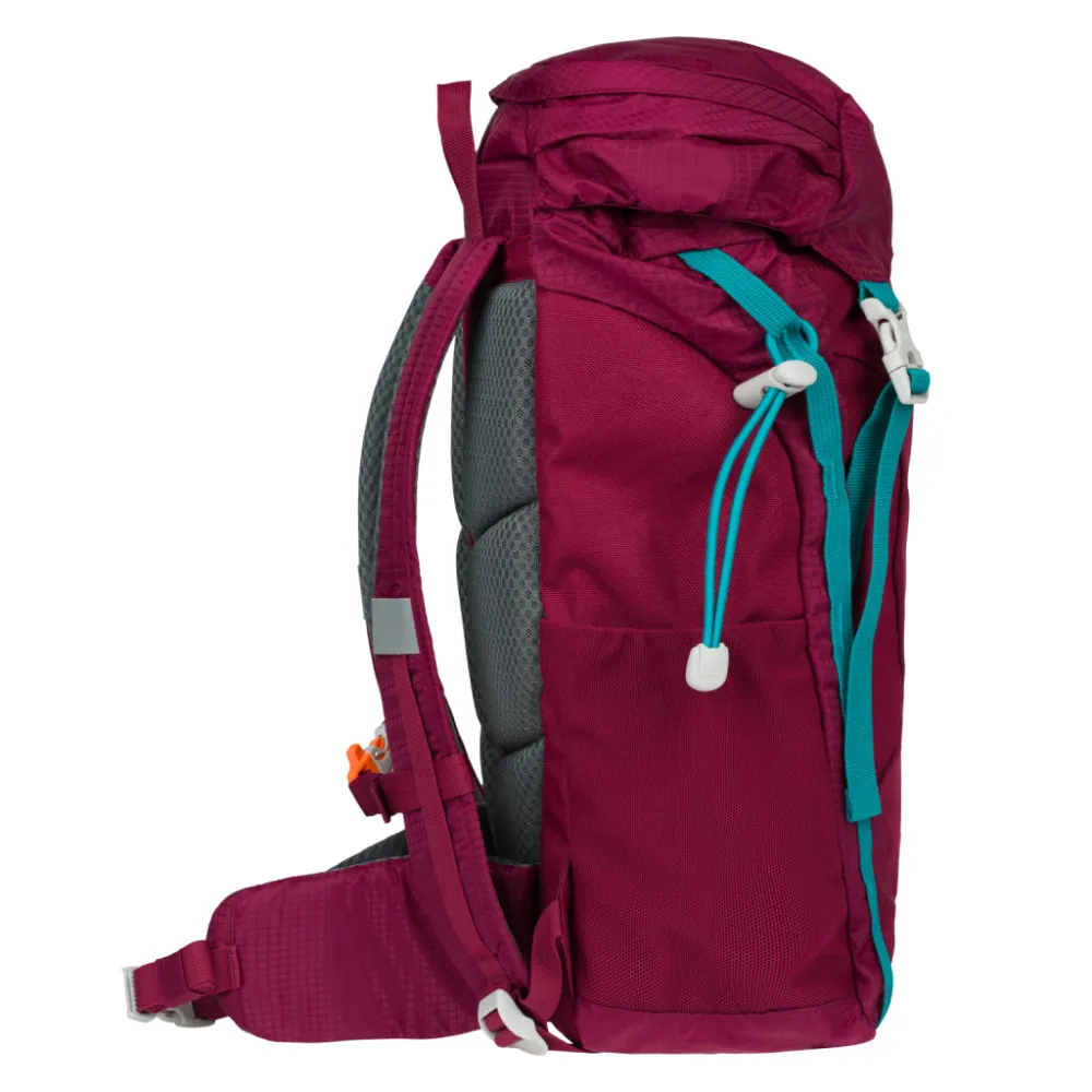 Vínový outdoorový batoh Tracker s tyrkysovými popruhy a polstrovanými zády s odvětráváním je vhodný pro děti od 3. třídy ZŠ.