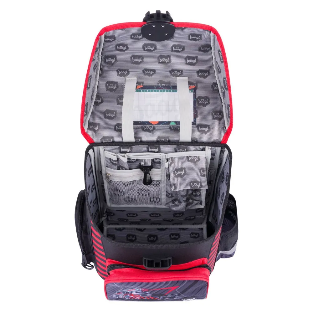 • Školní aktovka s vyztuženým tělem, vnitřním organizérem a třemi oddělenými kapsami a zapínáním na kvalitní přezku.