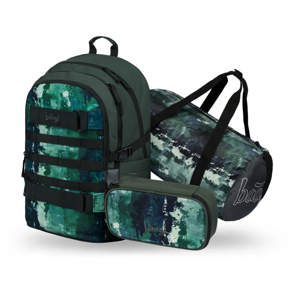 Detailní popis: BAAGL SET 3 Skate Forest: batoh, penál, sportovní taška GRS