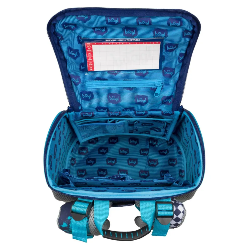 • Uvnitř aktovky je průhledná kapsa s rozvrhem a vnitřní organizér umožňující rovnoměrné rozložení hmotnosti, doplněný gumičkou pro fixaci.