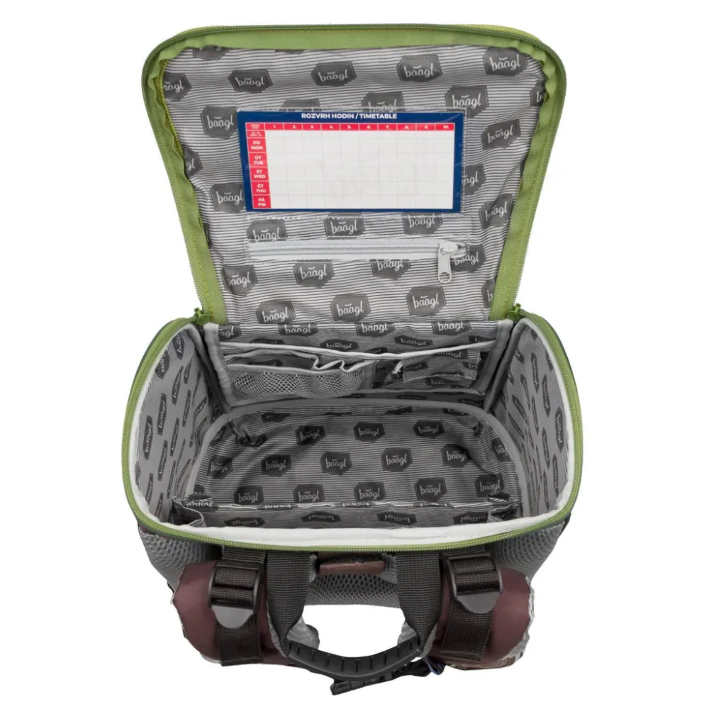 • Uvnitř aktovky je průhledná kapsa s rozvrhem a vnitřní organizér umožňující rovnoměrné rozložení hmotnosti, doplněný gumičkou pro fixaci.