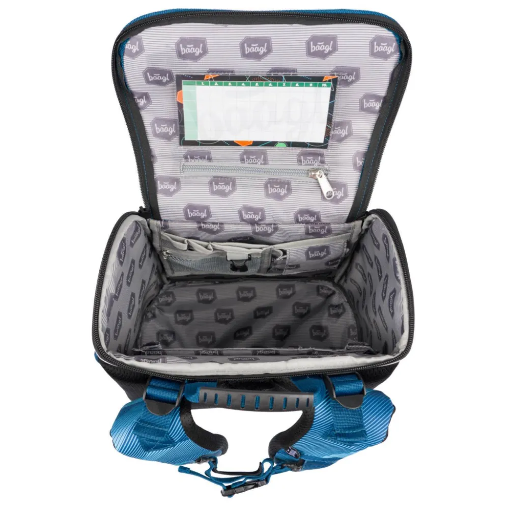 • Uvnitř aktovky je průhledná kapsa s rozvrhem a vnitřní organizér umožňující rovnoměrné rozložení hmotnosti, doplněný gumičkou pro fixaci.