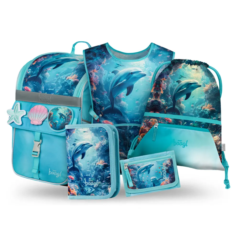 Detailní popis: BAAGL SET 5 Zippy Delfín: aktovka, penál, sáček, zástěra, peněženka