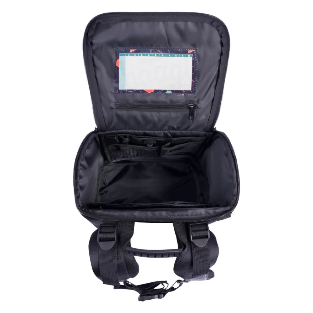 • Uvnitř aktovky je průhledná kapsa s rozvrhem a vnitřní organizér umožňující rovnoměrné rozložení hmotnosti, doplněný gumičkou pro fixaci.