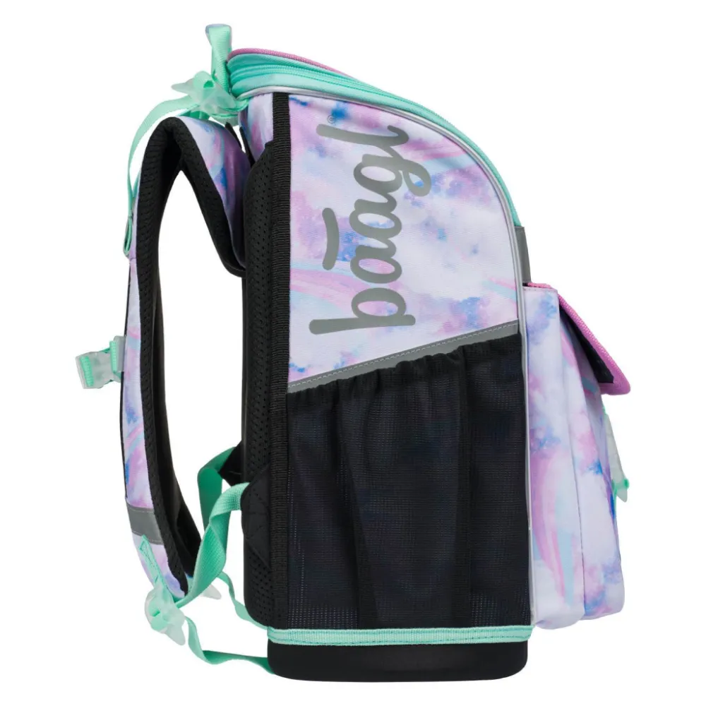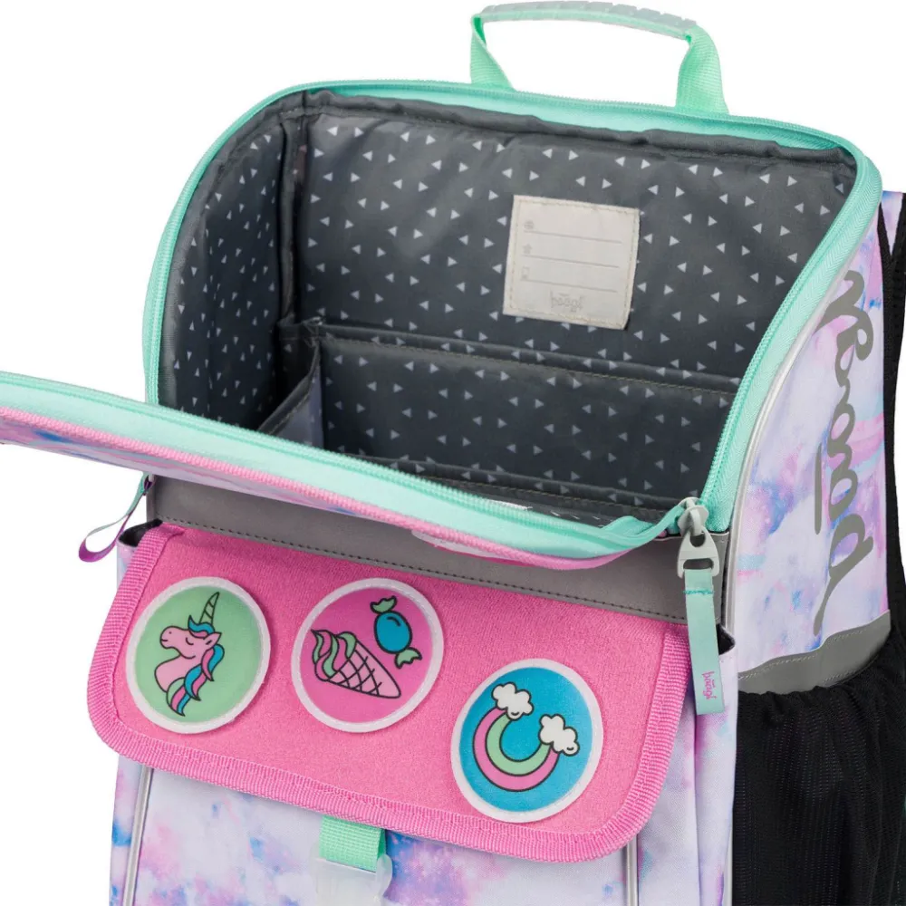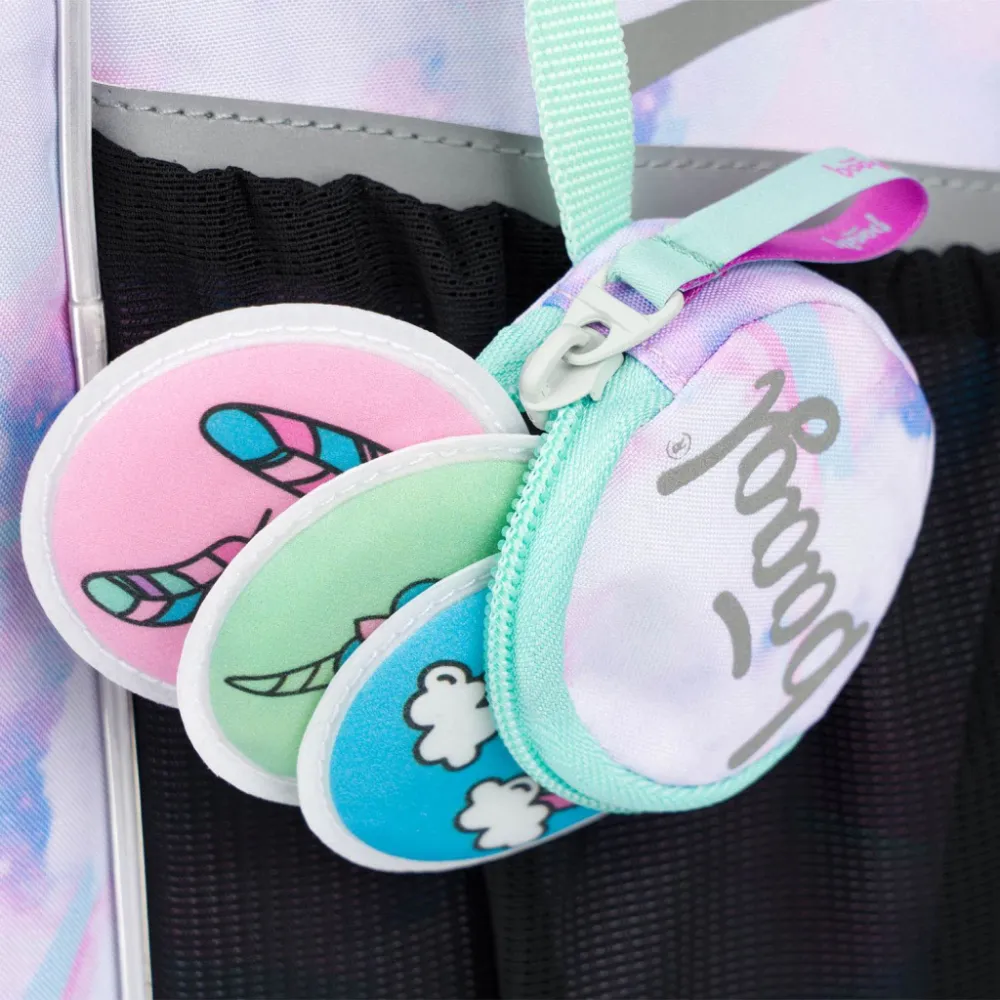 • Uvnitř aktovky je průhledná kapsa s rozvrhem a vnitřní organizér umožňující rovnoměrné rozložení hmotnosti, doplněný gumičkou pro fixaci.