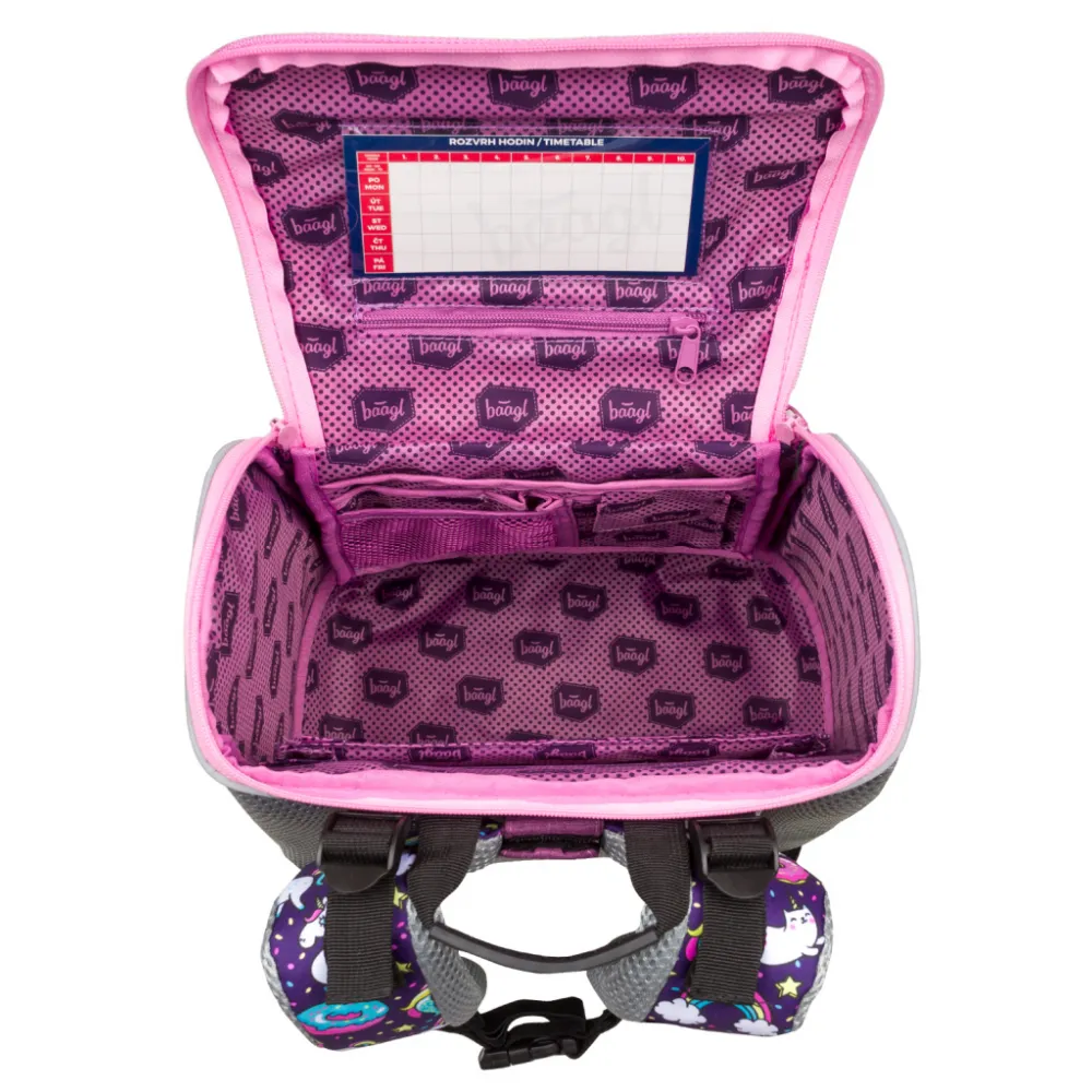 • Uvnitř aktovky je průhledná kapsa s rozvrhem a vnitřní organizér umožňující rovnoměrné rozložení hmotnosti, doplněný gumičkou pro fixaci.