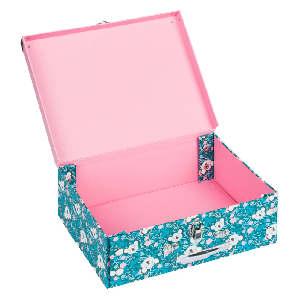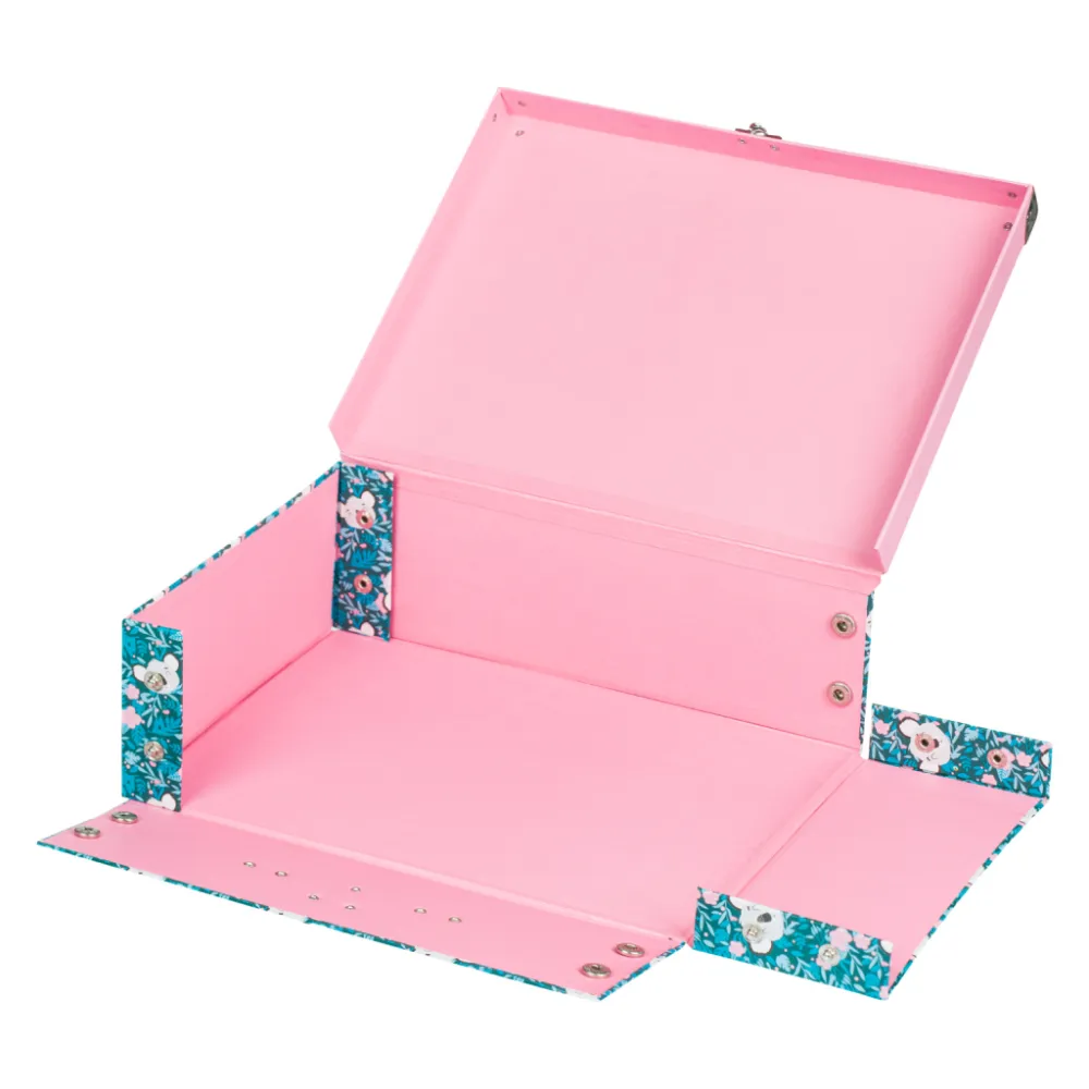 • Skládací kufřík z pevného laminovaného papíru s okovanými rohy.