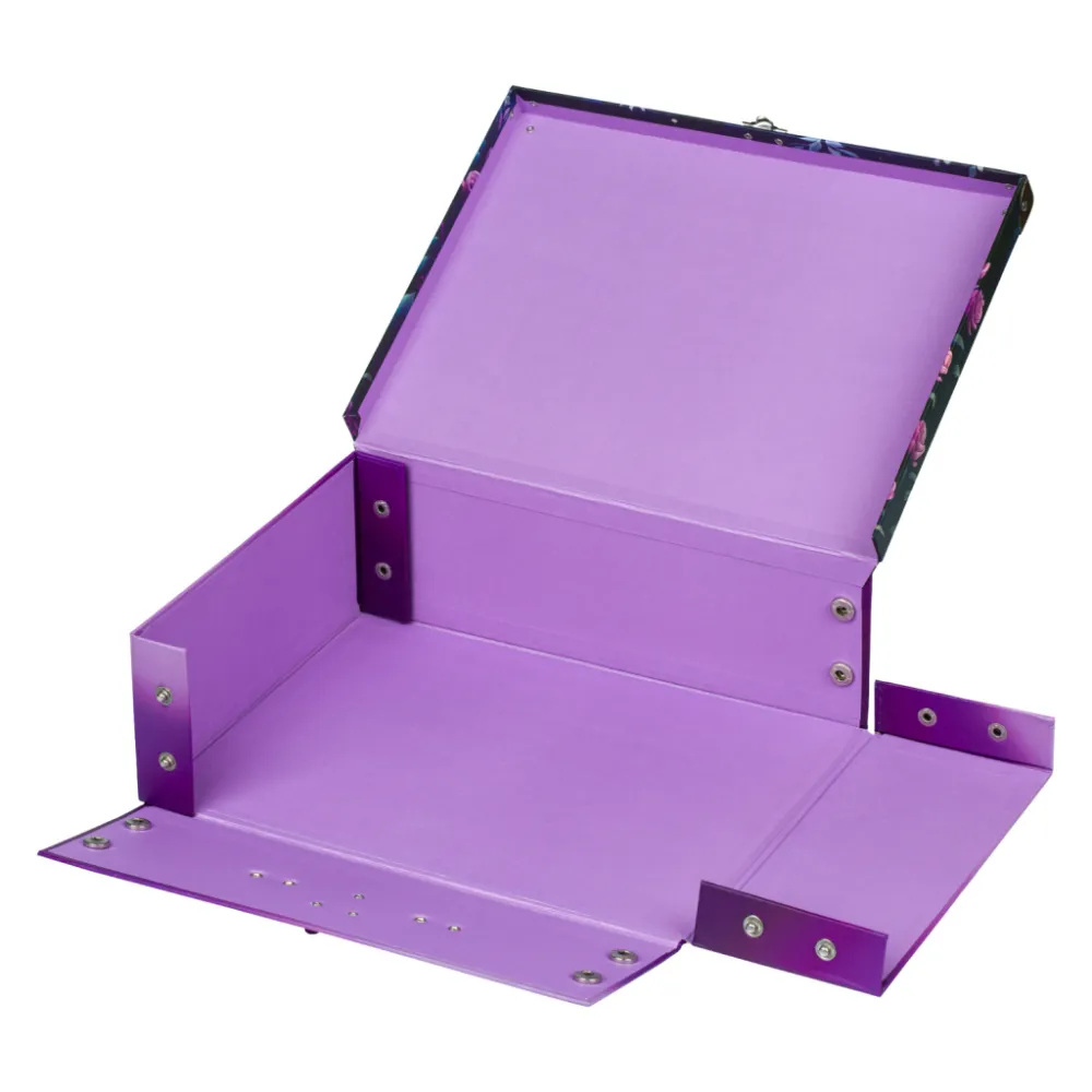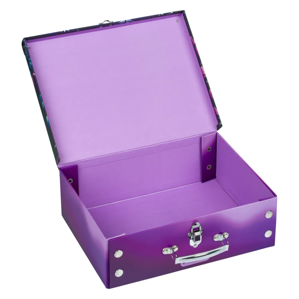 • Skládací kufřík z pevného laminovaného papíru s okovanými rohy.