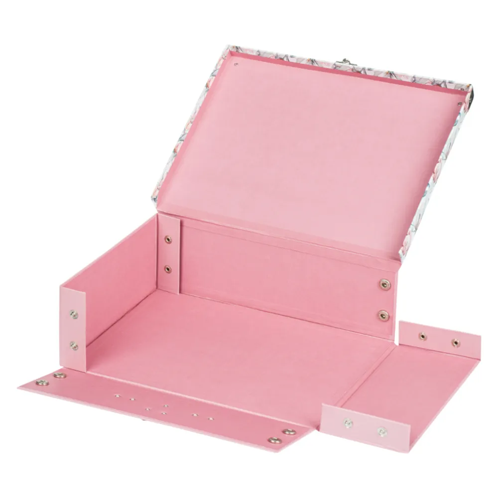 • Skládací kufřík z pevného laminovaného papíru s okovanými rohy.