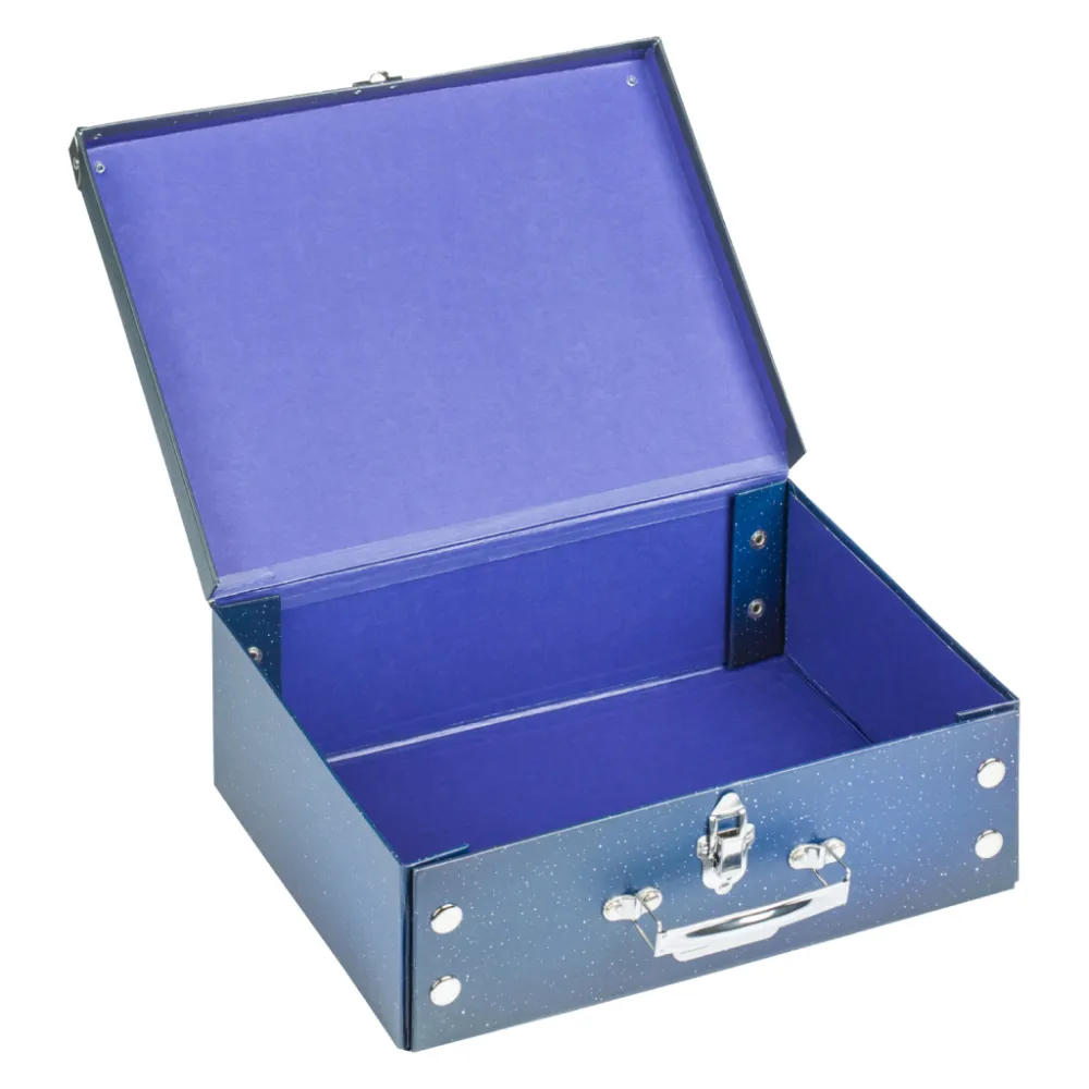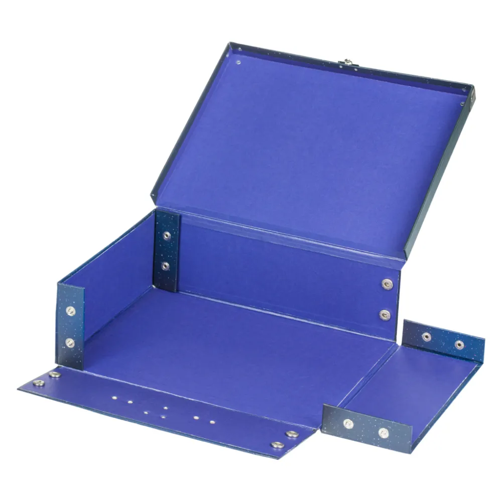 • Skládací kufřík z pevného laminovaného papíru s okovanými rohy.