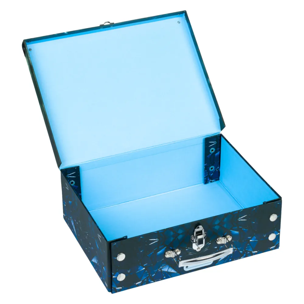 • Skládací kufřík z pevného laminovaného papíru s okovanými rohy.