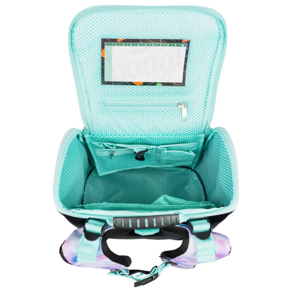 • Uvnitř aktovky je průhledná kapsa s rozvrhem a vnitřní organizér umožňující rovnoměrné rozložení hmotnosti, doplněný gumičkou pro fixaci.