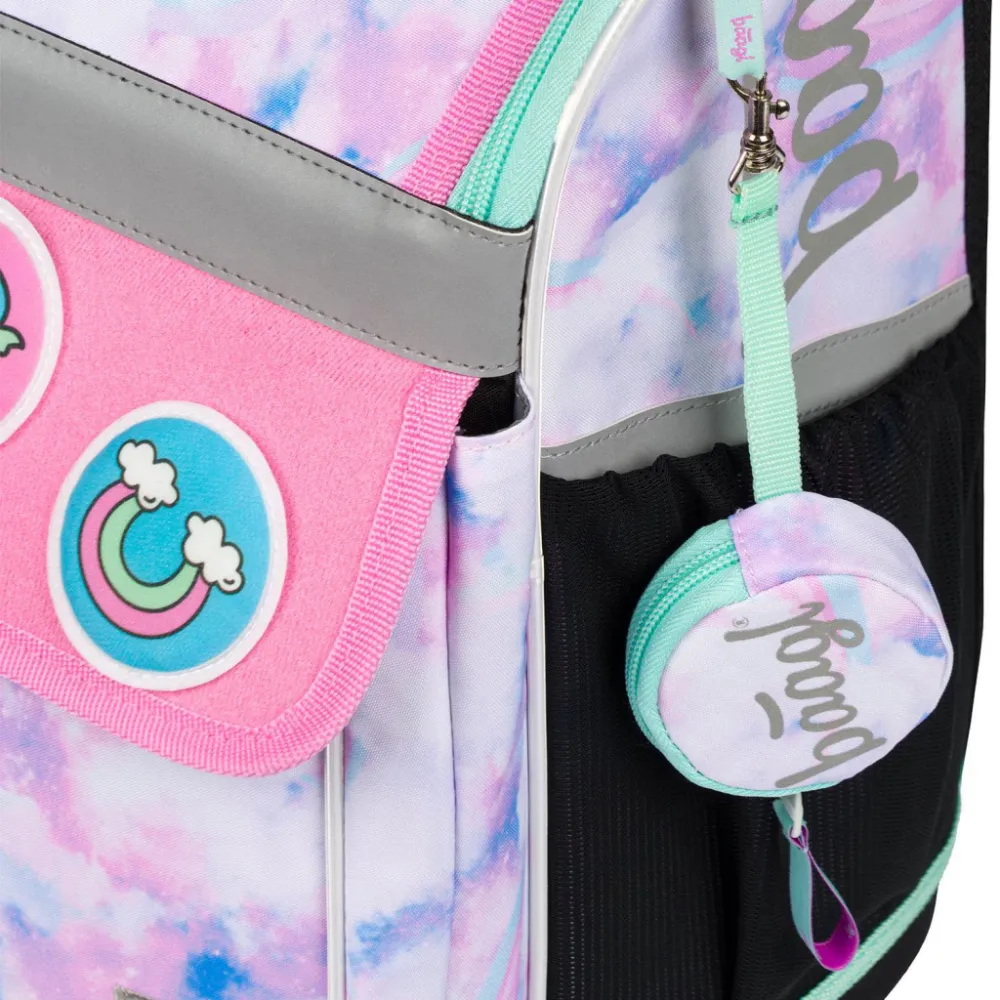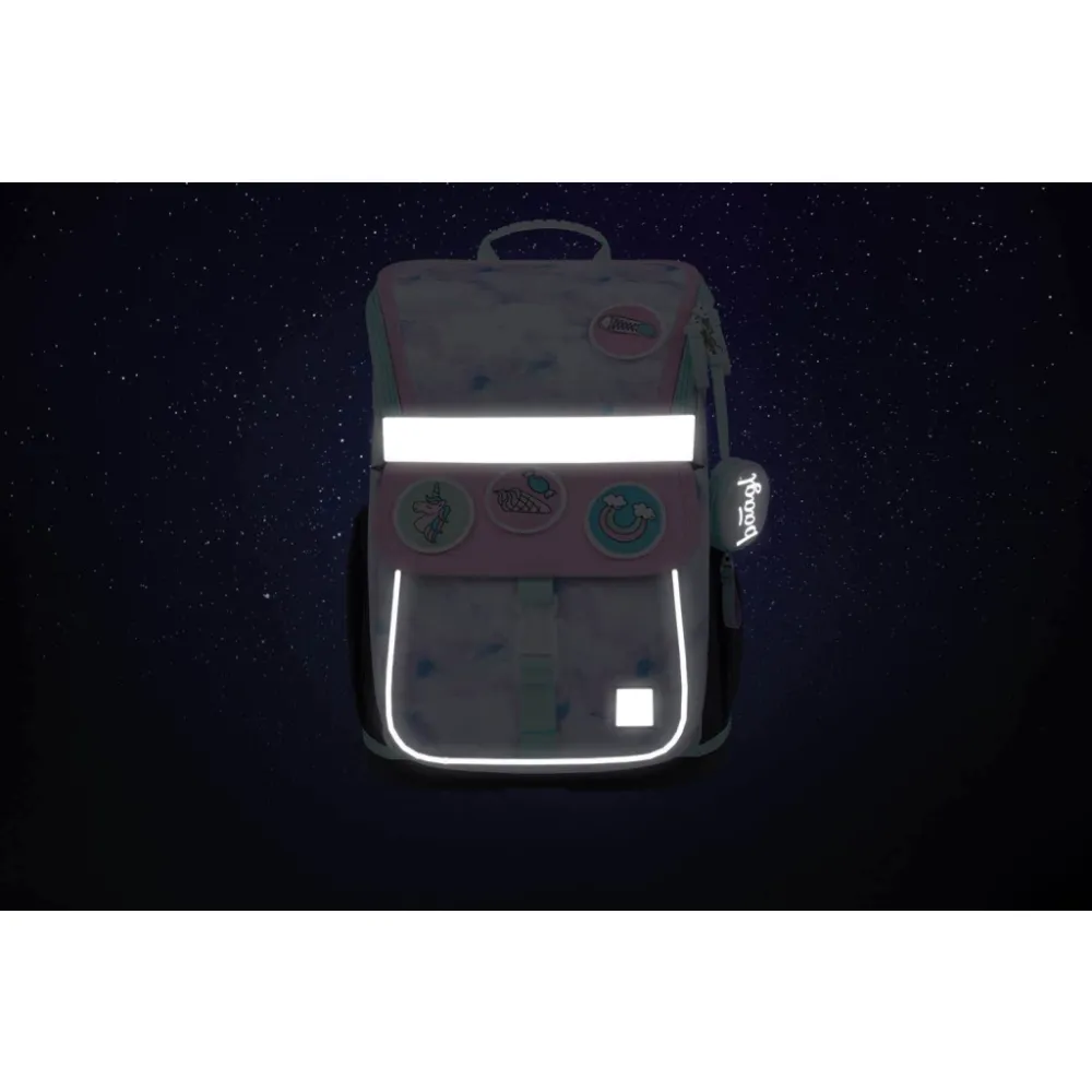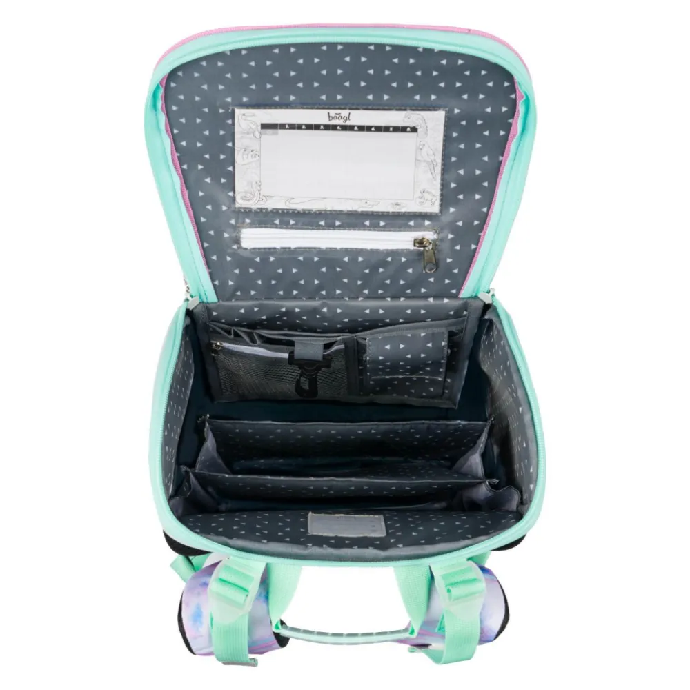 • Uvnitř aktovky je průhledná kapsa s rozvrhem a vnitřní organizér umožňující rovnoměrné rozložení hmotnosti, doplněný gumičkou pro fixaci.