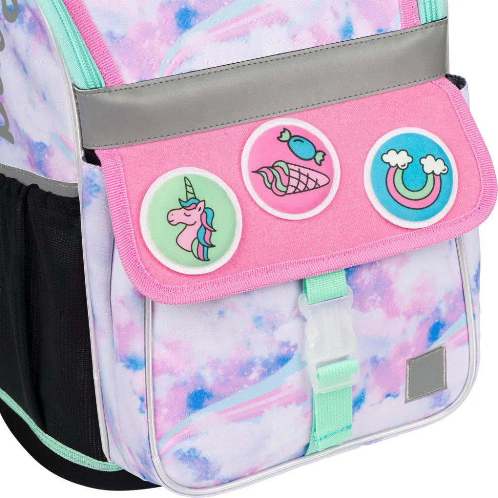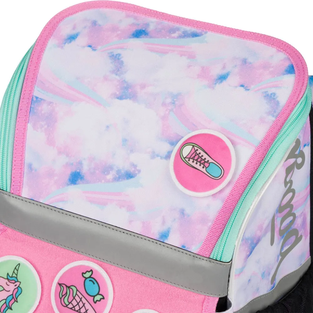 • Na klopu přední kapsy můžete libovolně připevňovat odznáčky, které jsou k aktovce jako dárek.