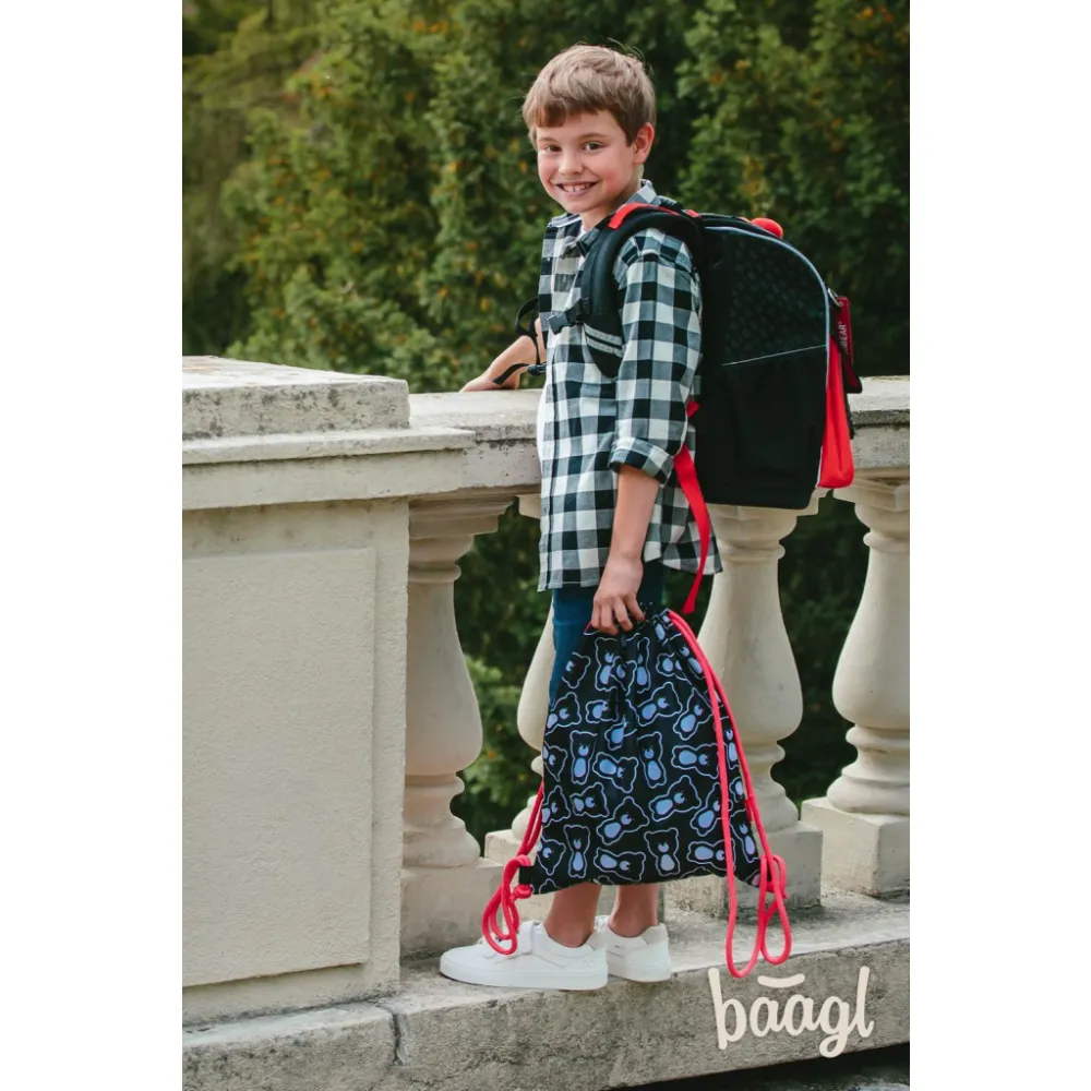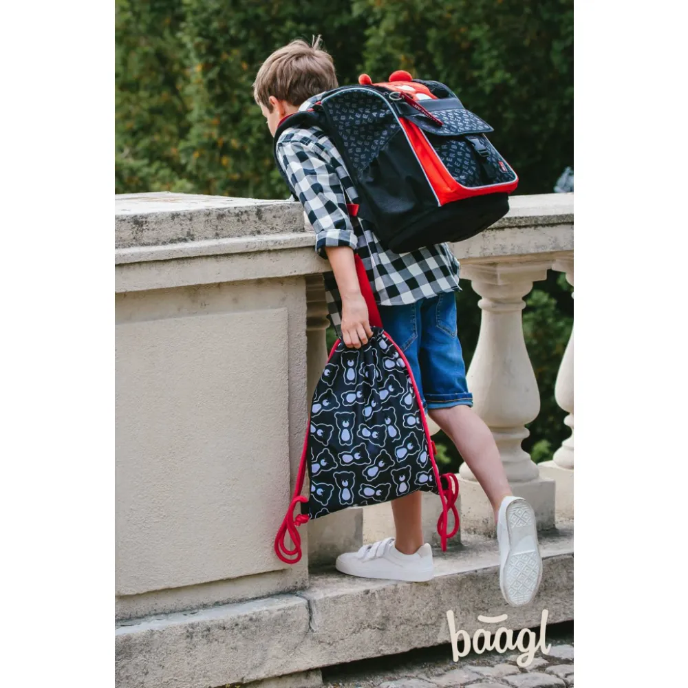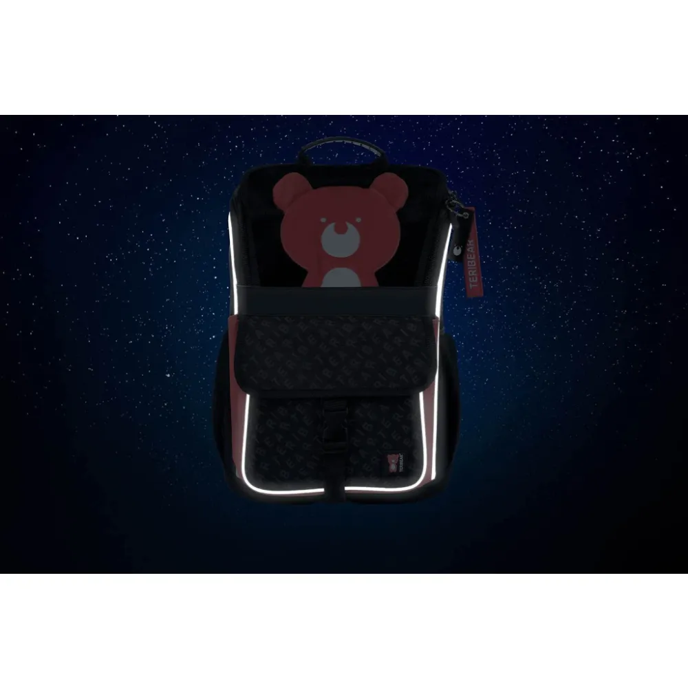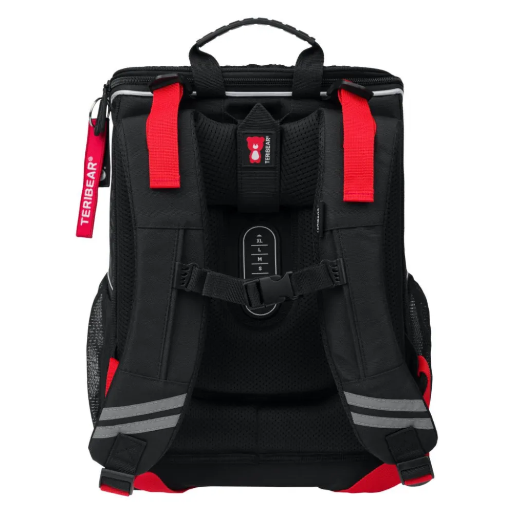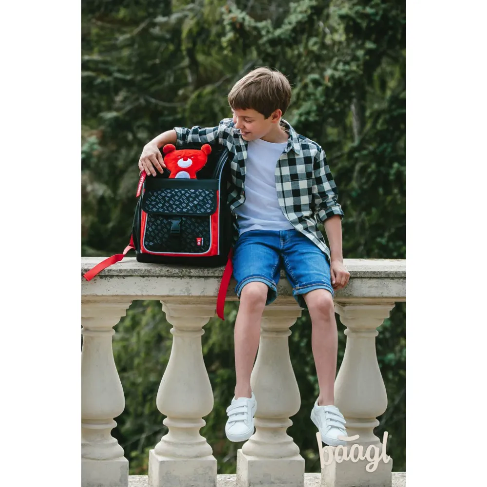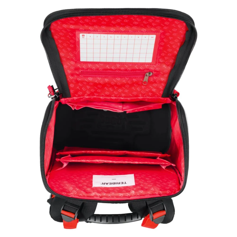 Černo-červená školní aktovka Zippy TERIBEAR s roztomilým plyšovým medvídkem na klopě. Je vhodná pro žáky 1. – 2. třídy ZŠ.