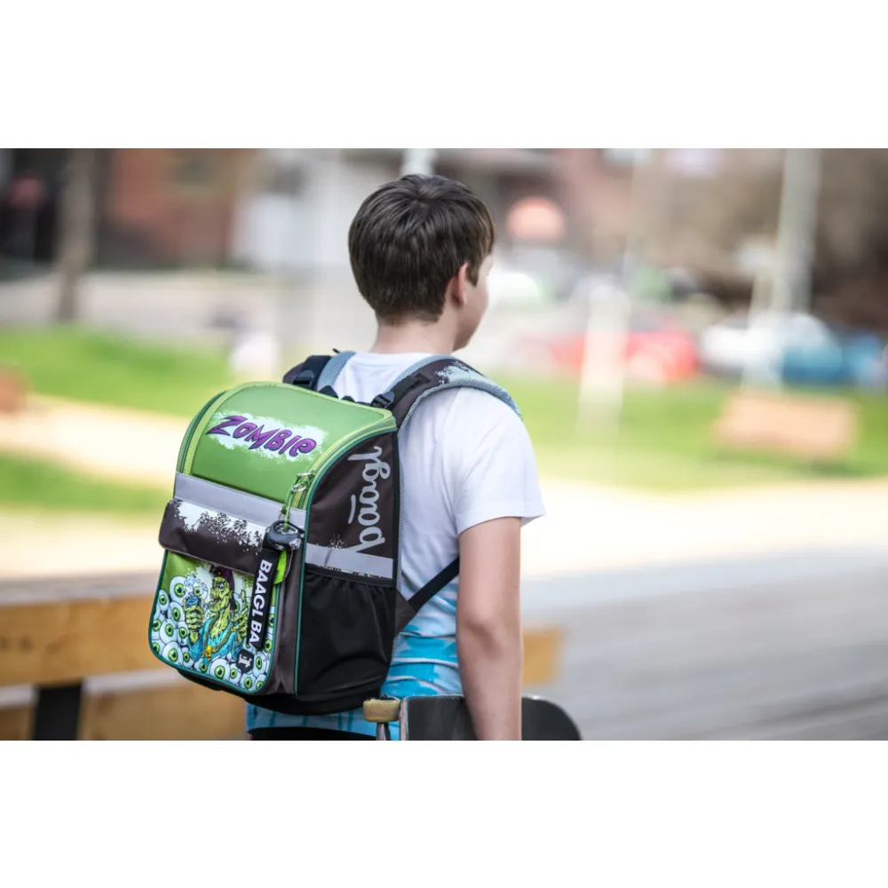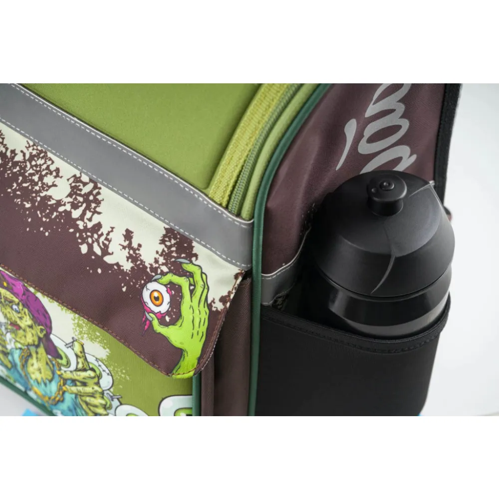 Školní aktovka Zippy Zombie v zelené barvě, vhodná pro žáky 1.–2. třídy ZŠ. Aktovka byla úspěšně testována v ITC Zlín.