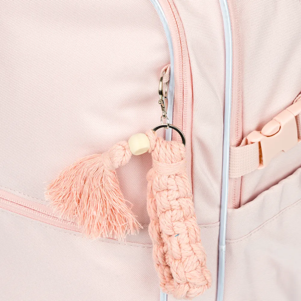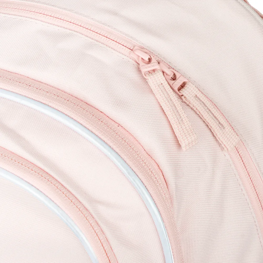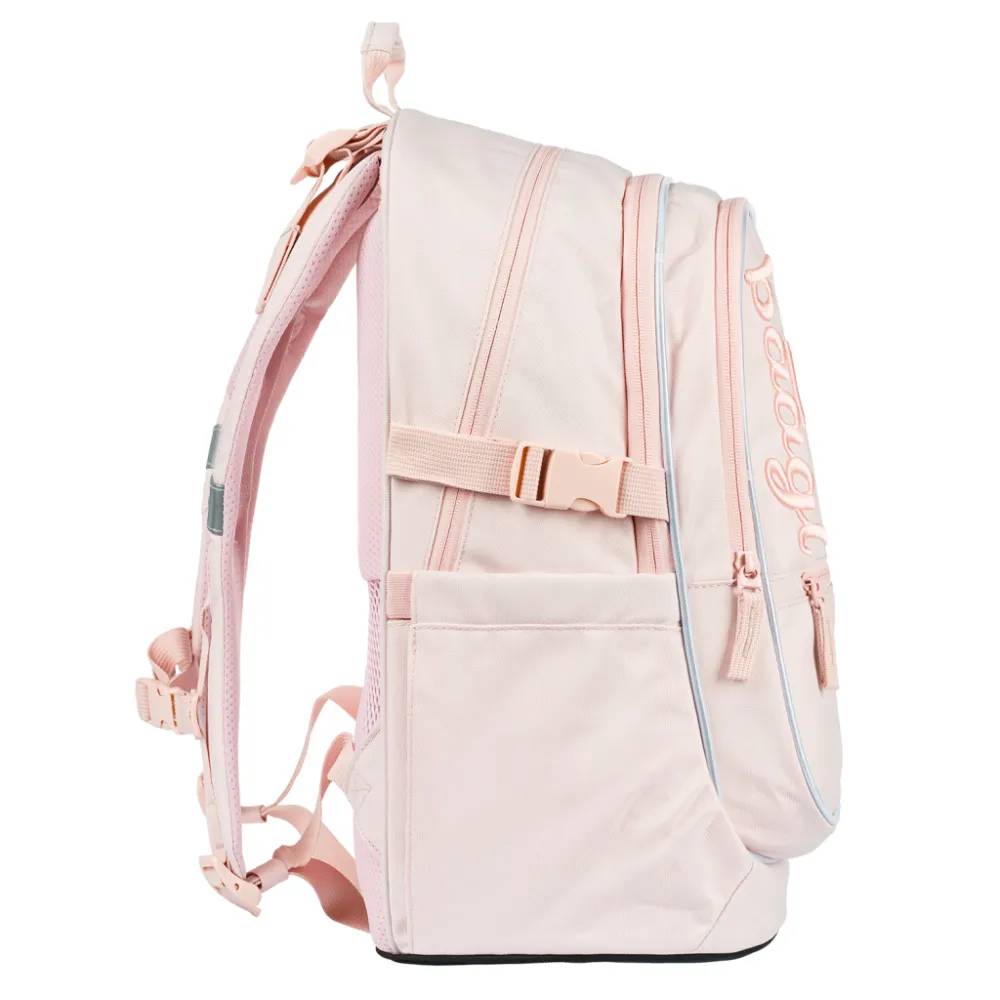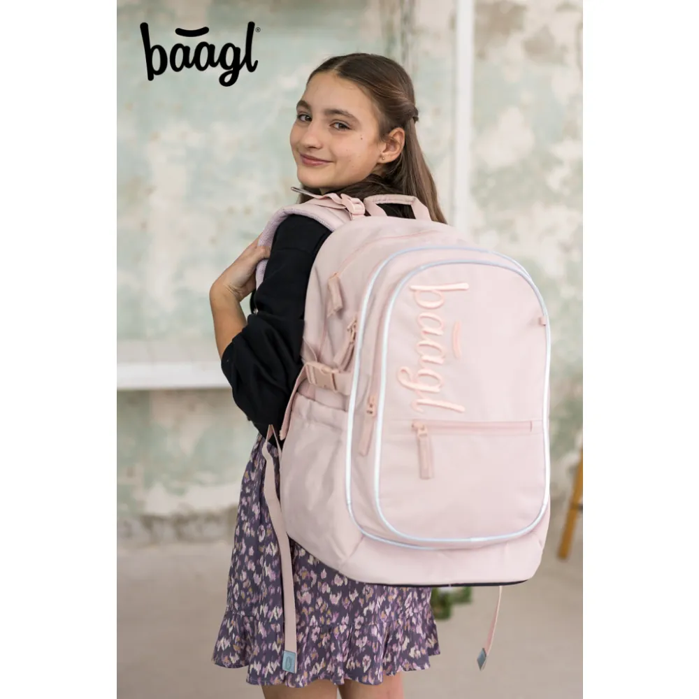 Krémově růžový batoh s decentním logem BAAGL, bužírkou a jemnými detaily se stane nezbytnou součástí outfitu každé školačky. Je vyrobený z recyklovaného materiálu a jeho minimalistický design se zkrátka neomrzí.