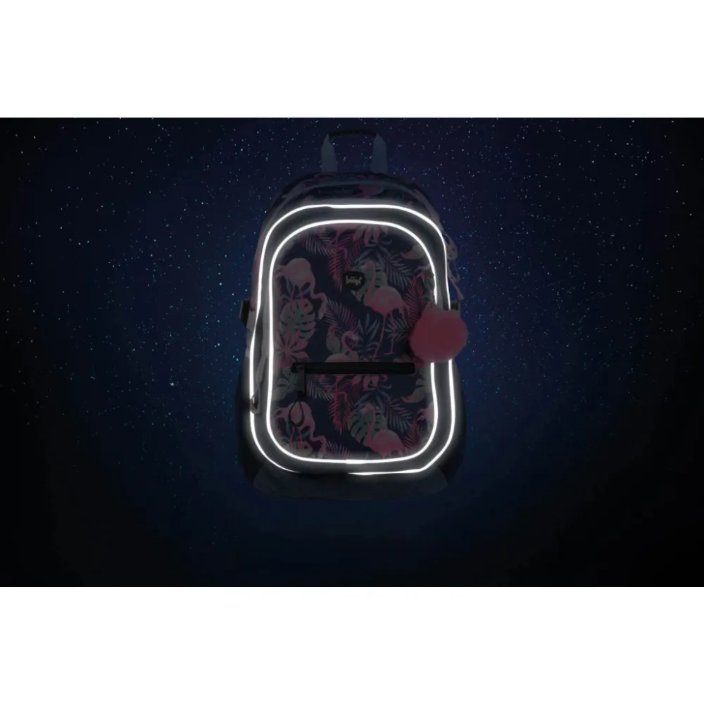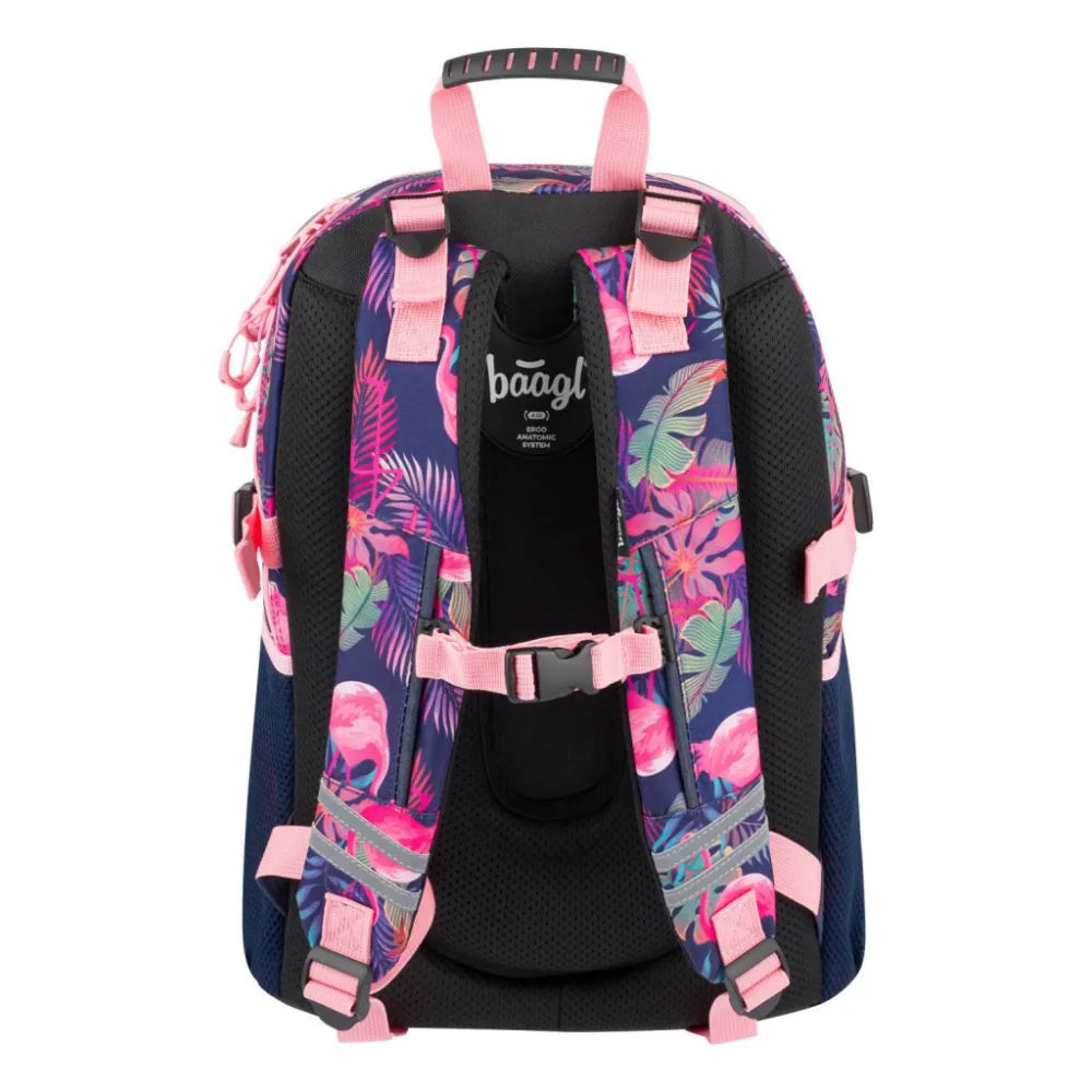 Školní batoh Flamingo s potiskem trendy plameňáků, vhodný od 3. třídy 1. stupně ZŠ a také pro 2. stupeň ZŠ. Batoh byl úspěšně testován v ITC Zlín.