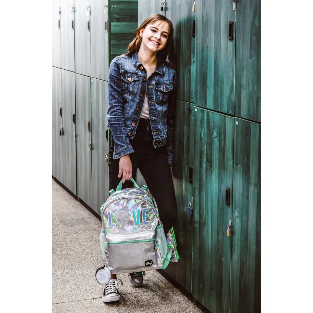 Školní batoh Fun Love vyrobený z holografické fólie, vhodný od 3. třídy 1. stupně ZŠ a také pro 2. stupeň ZŠ. Batoh byl úspěšně testován v ITC Zlín.