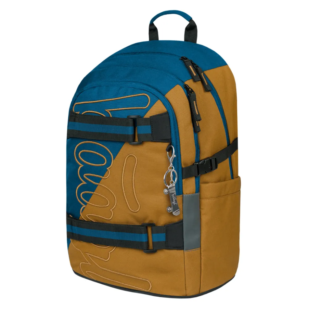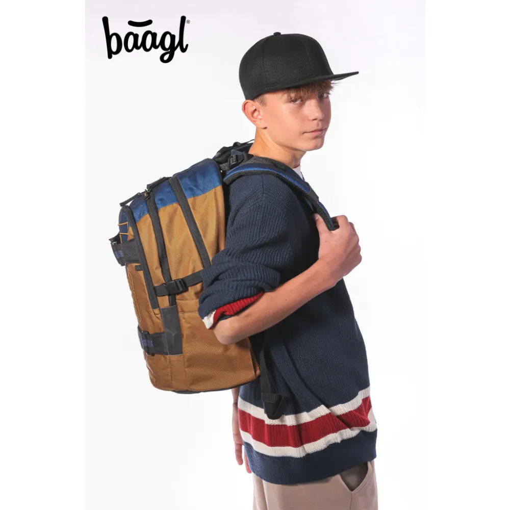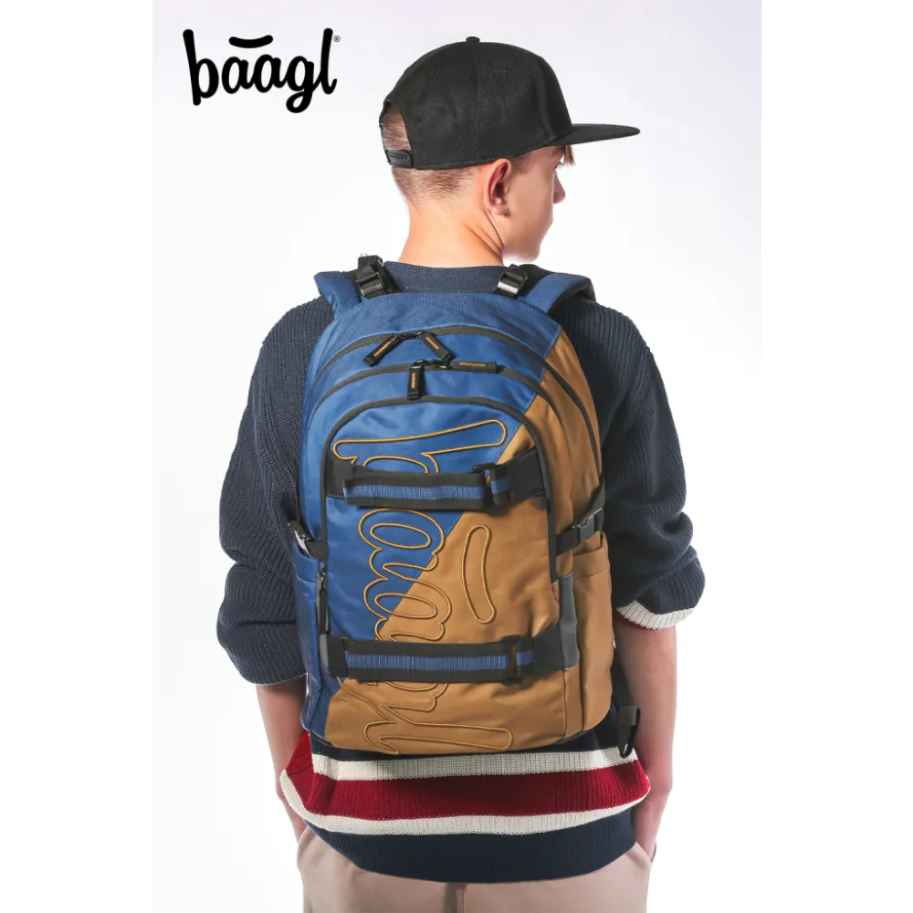 Karamelovo–modrý batoh Skate s logem BAAGL, anatomicky tvarovaným zádovým systémem a popruhy na uchycení skateboardu je ideální pro děti od 3. třídy ZŠ..