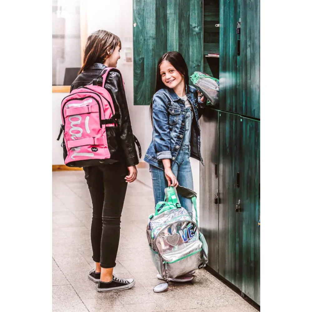 Školní batoh Skate Pink s reflexním logem Baagl na přední straně, vhodný od 3. třídy 1. stupně ZŠ a také pro 2. stupeň ZŠ. Batoh byl úspěšně testován v ITC Zlín.