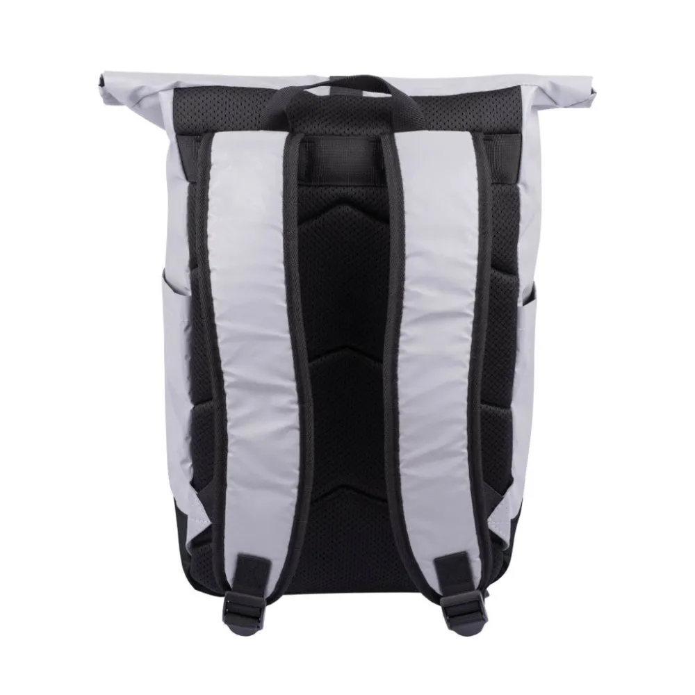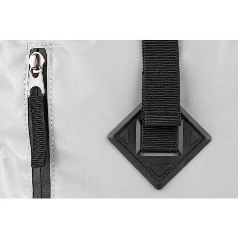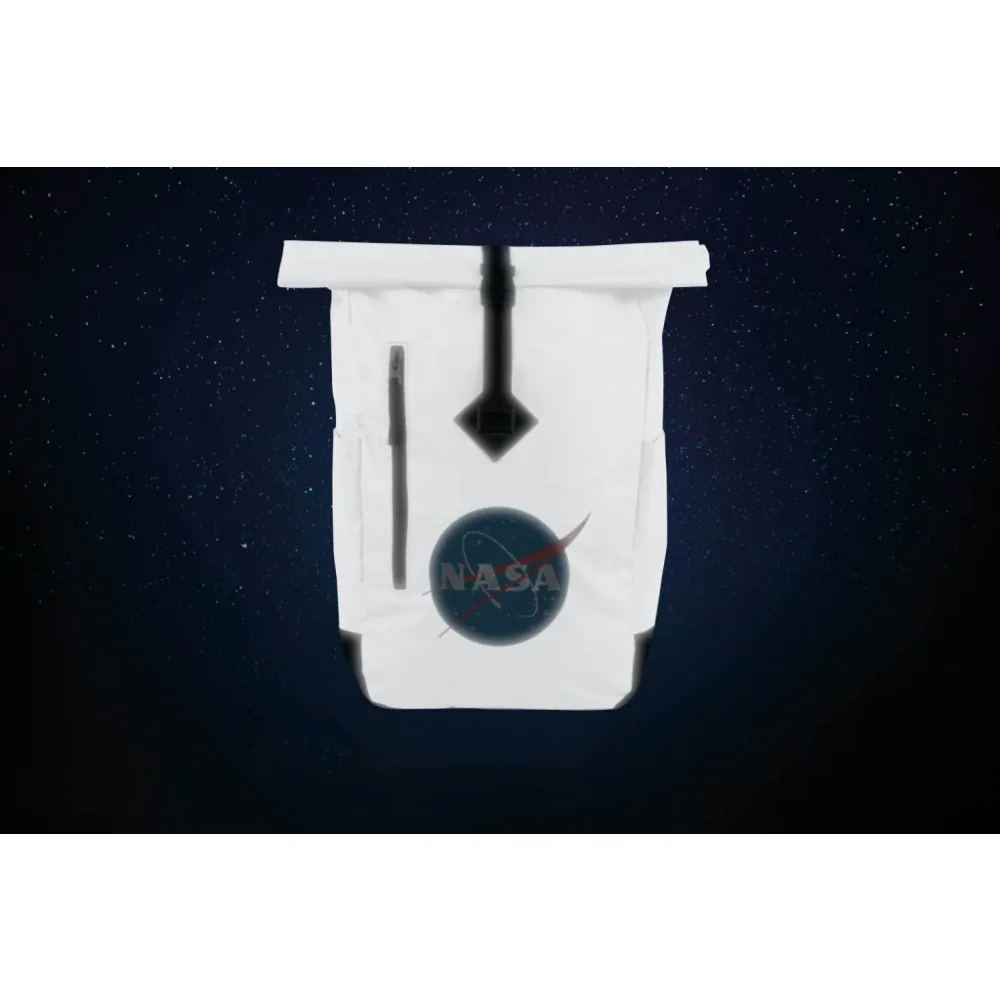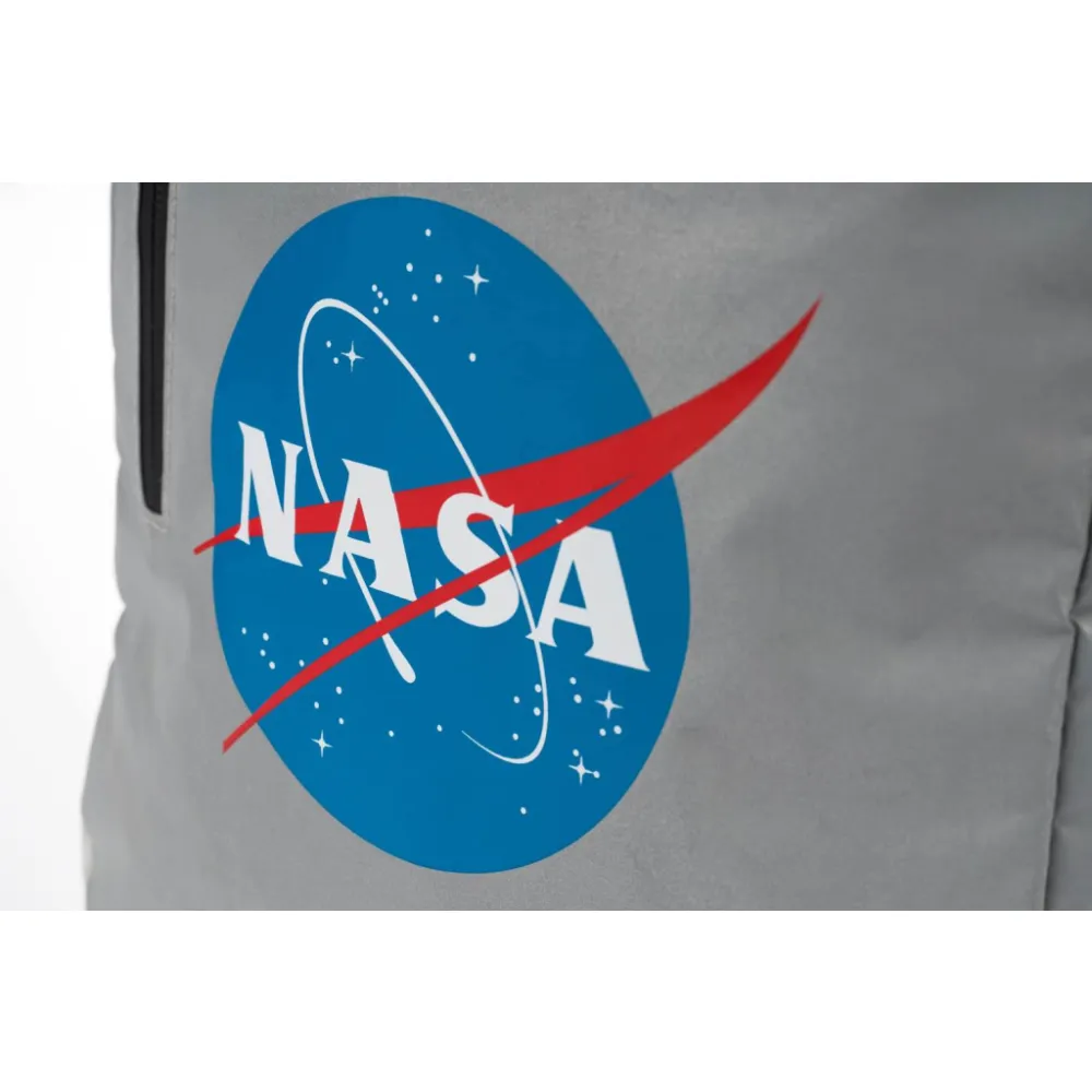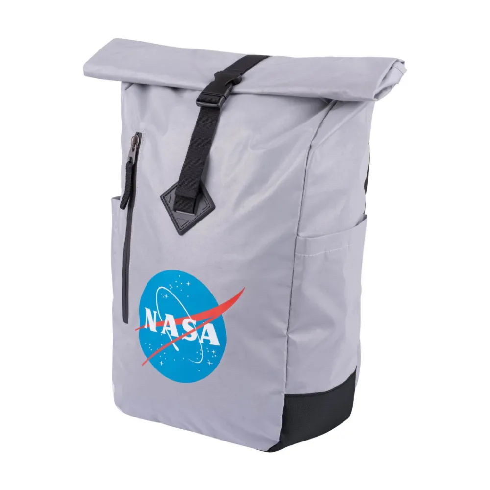 • Stříbrný lifestylový roll-top batoh ušitý z reflexního materiálu, doplněný o ikonické logo NASA.