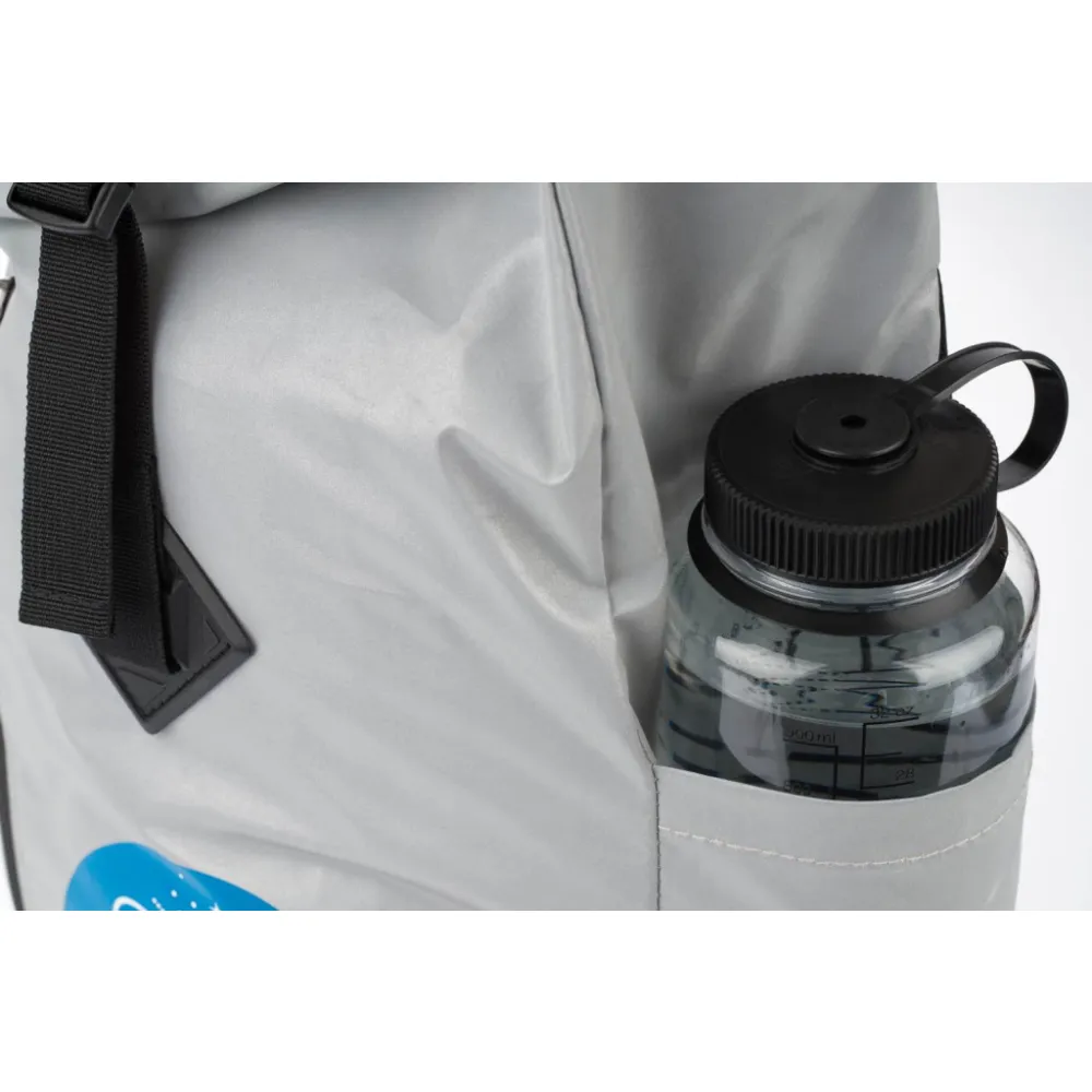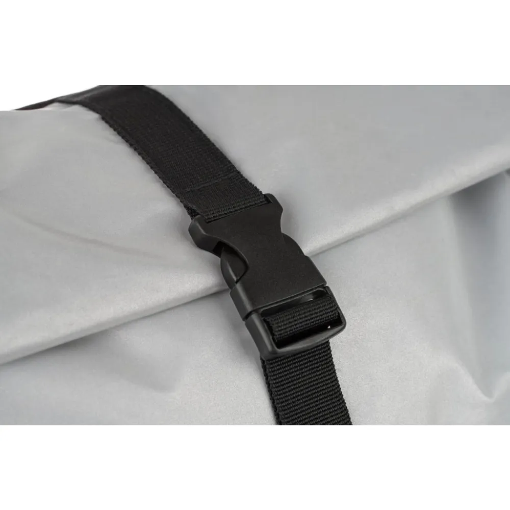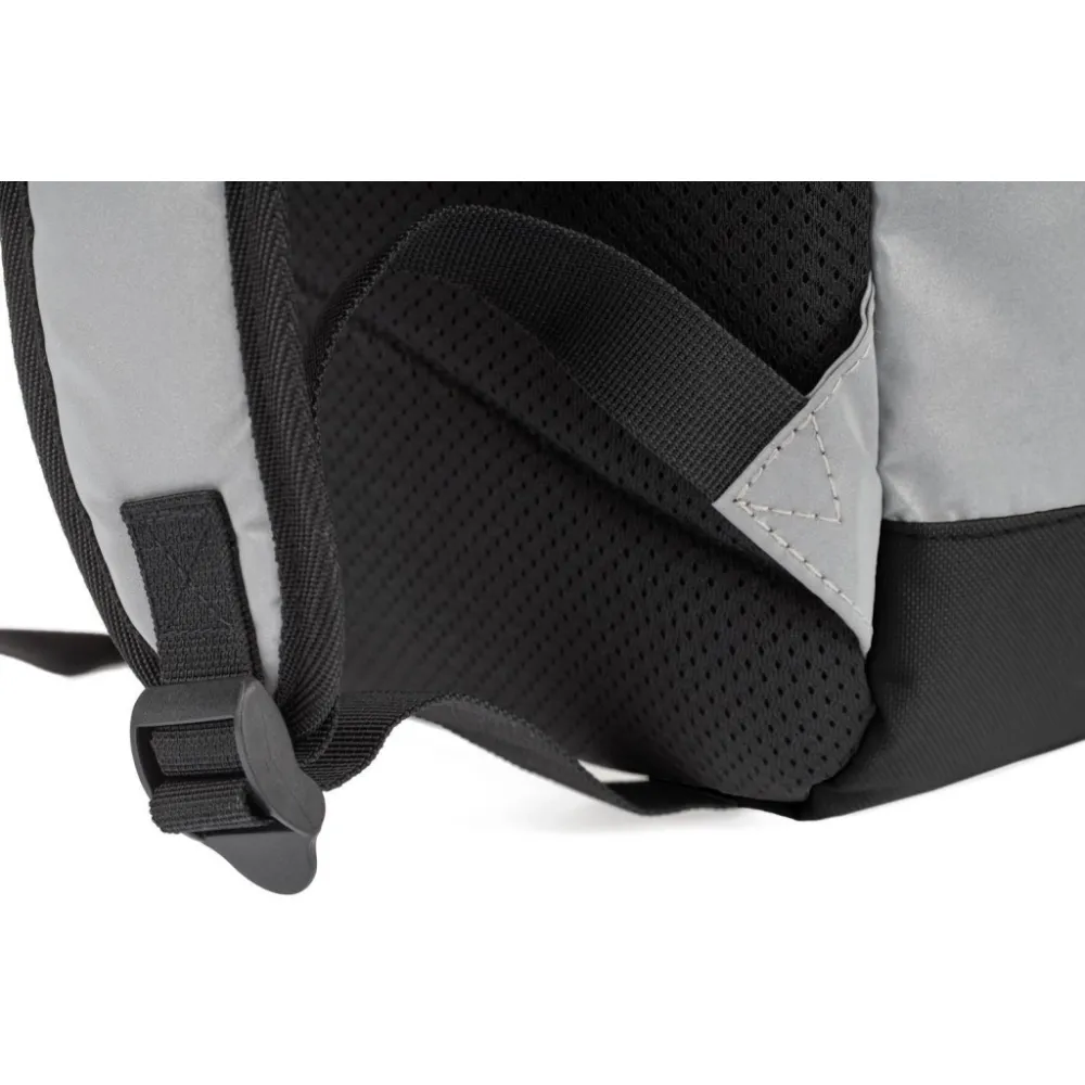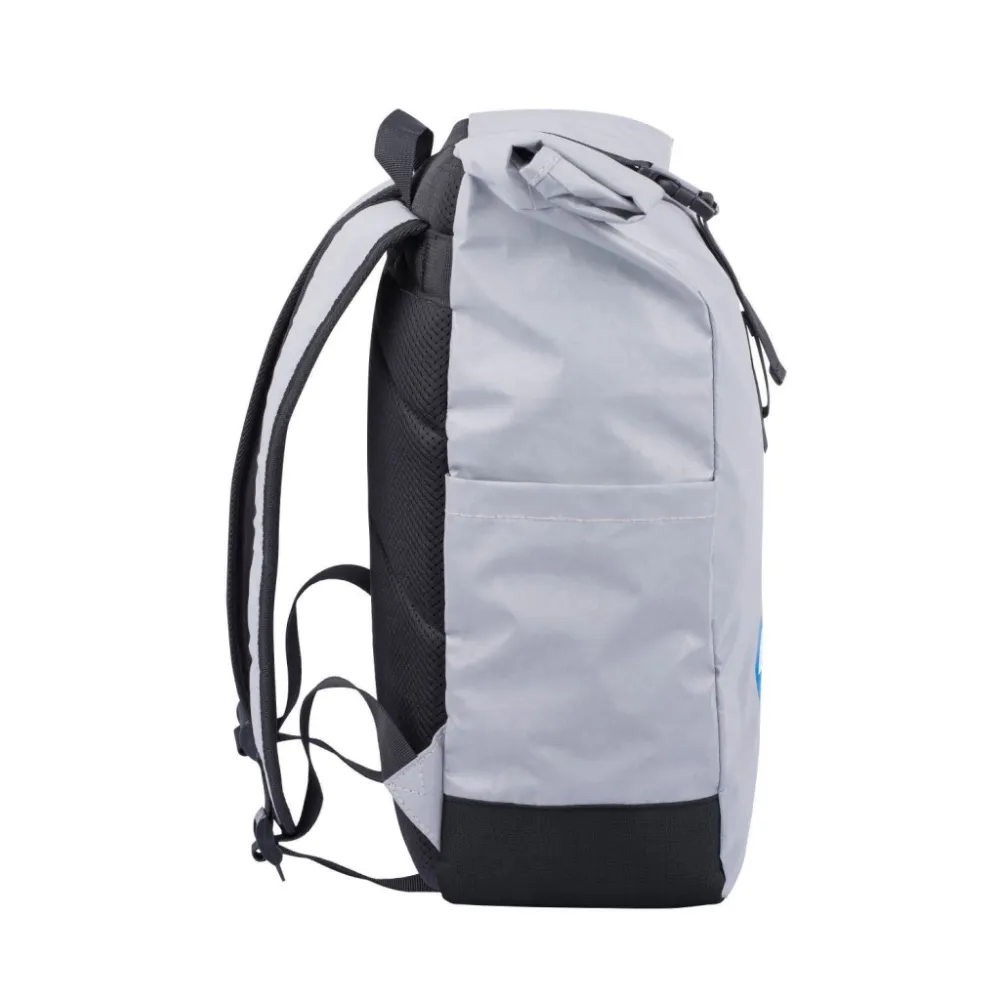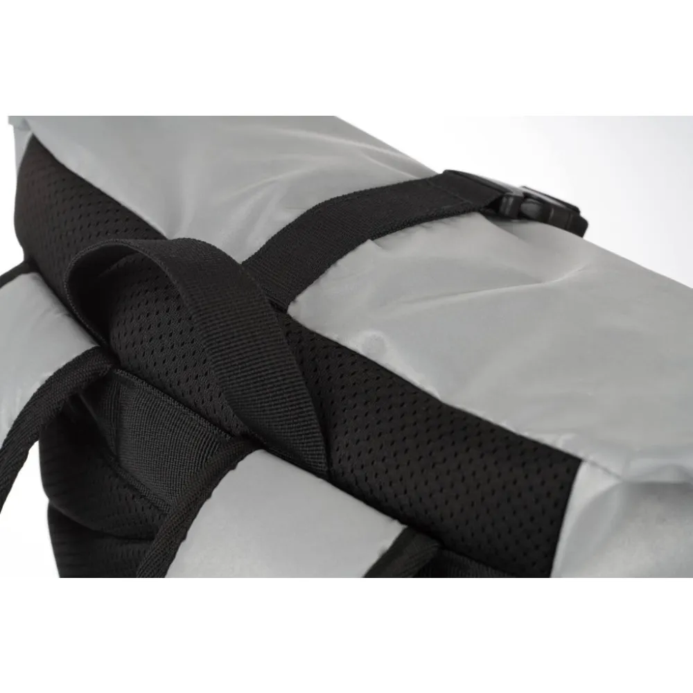• Stříbrný lifestylový roll-top batoh ušitý z reflexního materiálu, doplněný o ikonické logo NASA.