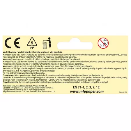 Balónek MFP M neon vodní bomba 50ks. Vodní bomby jsou nafukovací balónky, které se napouští vodou a slouží jako munice v horkých dnech. Sada obsahuje také nálevku. Uvedená cena je za 1 balení. Varování: Vhodné pro děti od 8 let. Děti se mohou prasklými či vyfouknutými balónky zadusit nebo uškrtit. Používejte pouze pod dozorem dospělé osoby. Dospělá osoba se po naplnění balónku musí přesvědčit, že jej děti používají bezpečně. Vyfouklé balónky udržujte mimo dosah dětí a prasklé ihned zlikvidujte. Nepřibližujte balónky k očím a obličeji. Při prasknutí může balónek způsobit zranění. Vyrobeno z přírodního kaučuku, latexu. Určeno k dekorativním účelům. Nebezpečí vdechnutí a spolknutí malých částic.