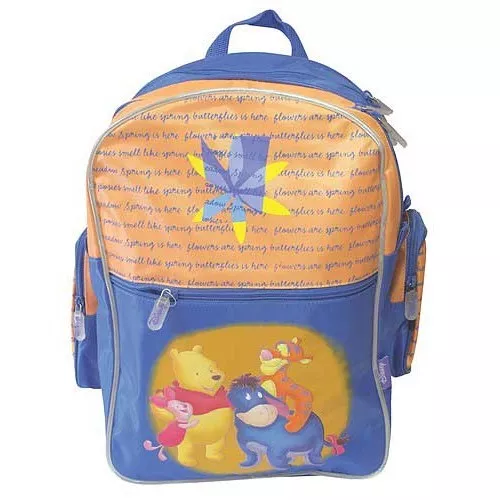 Batoh medvídek Pú a jeho kamarádi, modro-oranžový. Kvalitní dvoukomorový batoh, výborný pomocník pro předškolní děti vhodný i na výlety.