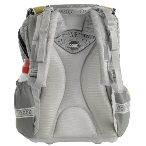 Precizně zpracovaný dvoukomorový školní batoh s klopou uzavíratelnou na suchý zip. Dvě přední kapsy na drobnosti uzavíratelné na zip, malá přední kapsa obsahující reflexní pláštěnku. Dvě praktické boční kapsy na gumičku pro umístění láhve. Zadní stěna vyztužena odlehčeným hliníkovým rámem, opatřena anatomickým polstrováním a nastavitelnými ramenními popruhy pro pohodlné dlouhodobé nošení. Dno je pevné a batoh je stabilní. Na povrchu bezpečnostní reflexní prvky. Součástí batohu je placatá láhev na pití. Rozměry batohu umožňují bezproblémové přenášení dokumentů formátu A4.