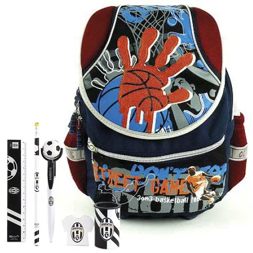 Batoh školní Cool 6-dílný set, basketbal, Juventus. Šestidílná sada - batoh COOL s motivem basketbalu a školní pomůcky: guma, pero, ořezávátko, pravítko a tužka, v designu kolekce Juventus.