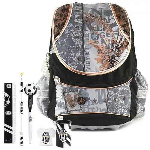 Precizně zpracovaný dvoukomorový školní batoh s klopou uzavíratelnou na suchý zip ve kterém najdete fantastické školní pomůcky v atraktivním designu italské sportovní kolekce Juventus! Kuličkové pero, pryž na gumování, ořezávátko, pravítko a grafitovou tužku. Školní batoh má dvě přední kapsy na drobnosti uzavíratelné na zip, malá přední kapsa obsahující reflexní pláštěnku. Dvě praktické boční kapsy na gumičku pro umístění láhve. Zadní stěna vyztužena odlehčeným hliníkovým rámem, opatřena anatomickým polstrováním a nastavitelnými ramenními popruhy pro pohodlné dlouhodobé nošení. Dno je pevné a batoh je stabilní. Na povrchu bezpečnostní reflexní prvky. Součástí batohu je placatá láhev na pití. Rozměry batohu 46x36x20cm umožňují bezproblémové umožňují bezproblémové přenášení dokumentů formátu A4.
