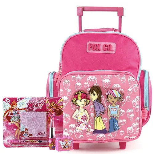 Batoh školní na kolečkách Cool 4-dílný set, jahůdky a tři holky. Čtyřdílná sada - batoh na kolečkách COOL s motivem jahůdek a tří holek Fox Co. značky COOL, v barvě růžové. Sada dále obsahuje: ořezávátko, pero, poznámkový bloček.