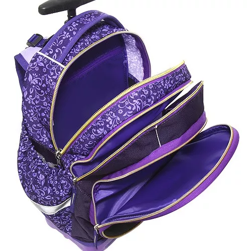 Batoh školní na kolečkách Target, Zlatý motýl, fialový. Perfektně zpracovaný batoh značky Target v atraktivním designu a moderní kombinaci barev má voděodolný povrch a jednokomorový vnitřní prostor. Hlavní komora je s velkou, plochou vnitřní kapsou na zip. Vpředu jsou dvě velké kapsy umístěné za sebou. Kapsy i komora uzavíratelné kvalitním, odolným kovovým zipem. Kryt přední kapsy lze zcela odepnout! Jeho výměnou získá Váš batoh zcela nový design! Kapsy na láhev jsou po obou stranách batohu, na vrchu stažené gumičkou. Batoh je opatřen vozítkem, který má na spodní straně čtyři plastová aretační kolečka a v horní části výsuvnou rukojeť pro snadný pohyb na rovném povrchu. Přední kolečka lze jednoduše vyměnit za opěrné nohy (nejsou součástí balení). Výškově nastavitelné, vyměkčené a prodyšné ramenní popruhy jsou v ideální šíři. záda jsou anatomicky polstrovaná. V horní části batohu je velké měkké poutko přizpůsobené dětské ruce. Reflexní prvky pro bezpečnost dětí v silničním provozu. Skvělý batoh, který udělá velkou radost všem školákům! Vhodný pro 2. stupeň základní školy.