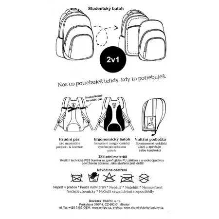 Větší má zádovou část s polstrováním a ergonomickým systémem pro ochranu páteře. Široké nosné řemeny jsou opatřeny výškově nastavitelným spojovacím prsním páskem. Dno batohu má vnitřní podložku, která zpevní jeho celkovou konstrukci a zajistí stabilitu batohu při jeho postavení na zem. Na předním dílu je pak velká kapsa na zip.