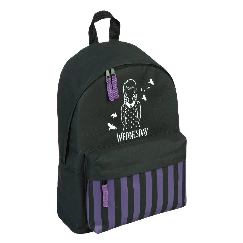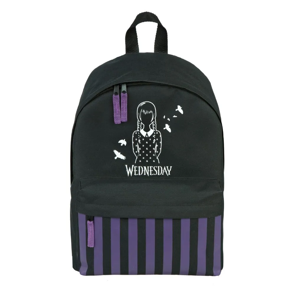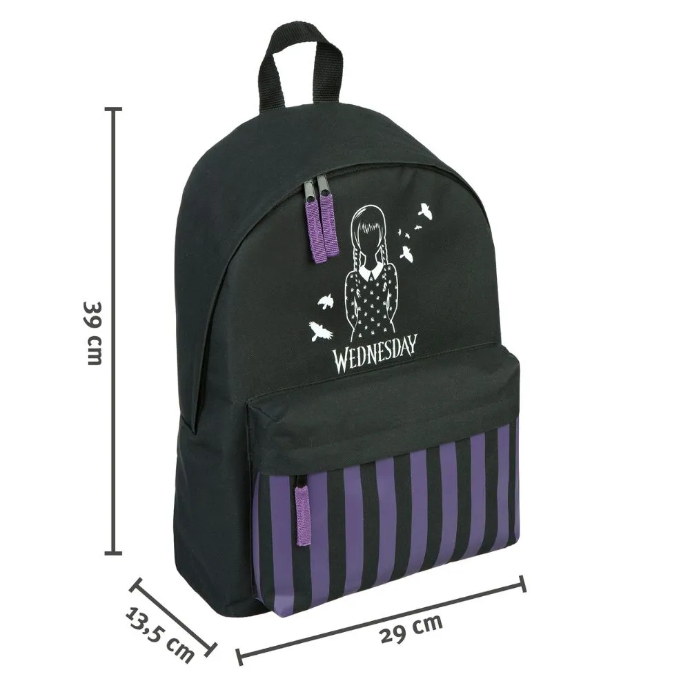 Batoh s motivem Wednesday kombinuje praktický design a osobitý styl. Nabízí prostornou hlavní kapsu a přední přihrádku na drobnosti či svačinu. Je vyroben z odolného polyesteru. Ideální společník do školy i na výlety.