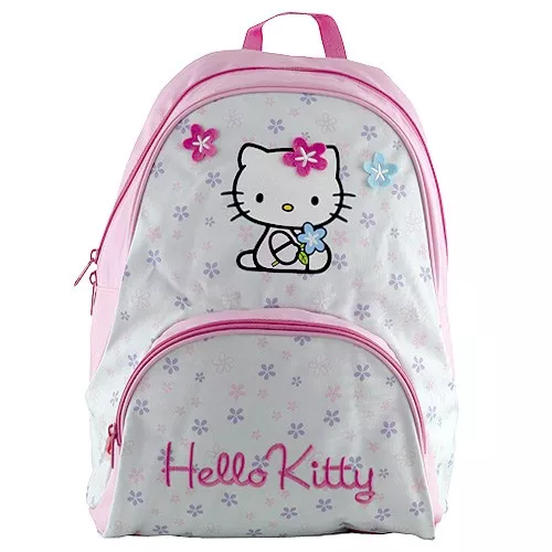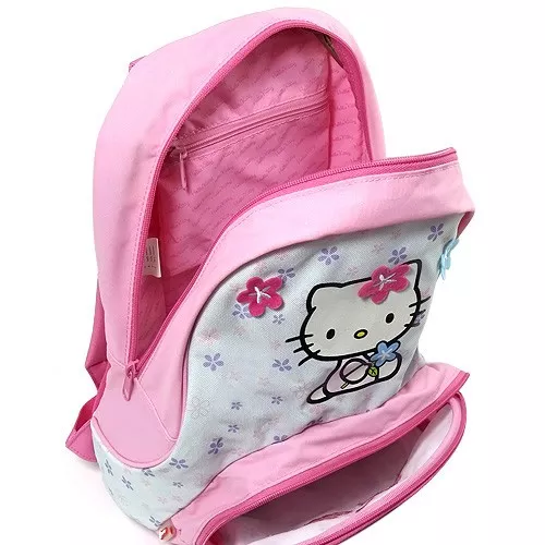Kvalitní jednokomorový dětský batoh s částečně vyztuženou zadní stěnou a měkkými nastavitelnými ramenními popruhy. Bezpečně uzavíratelný na zip s přední kapsou na svačinu. Na přední straně batůžku je ozdobný potisk oblíbené kočičky s kytičkami a nášivka Hello Kitty. V horní části najdete praktické poutko do ruky či na zavěšení. Výborný pomocník pro předškolní děti, vhodný i na výlety!