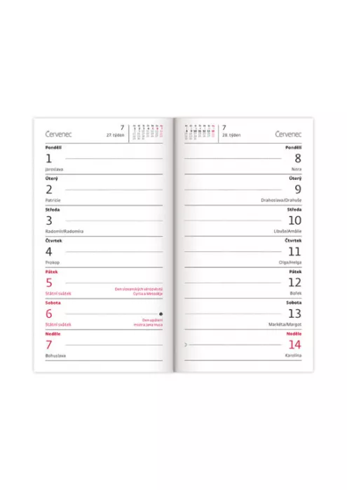 Rozměr: 85 x 154 mm Rozsah: 80 stran Kalendárium: 14denní české jmennéRozměr: 85 x 154 mm Rozsah: 80 stran Kalendárium: 14denní české jmenné