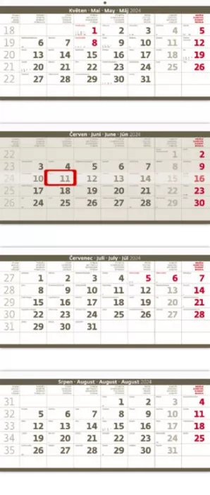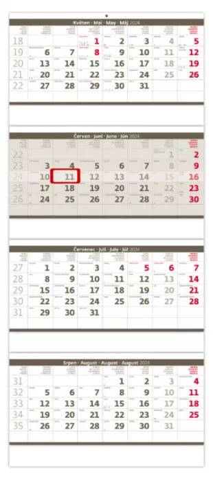 Čtyřměsíční skládaný kalendář šedý (N209-24). Formát kalendáře: 31,5 x 74 cm. Kalendárium: české čtyřměsíční jmenné + svátky vybraných evropských států.