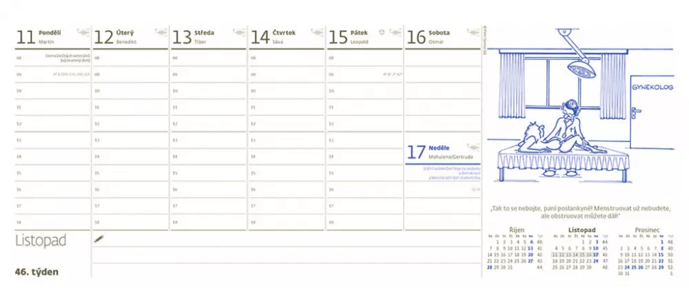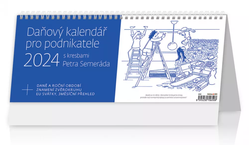 Formát kalendáře: 32,1 x 13,4 cm Kalendárium: české týdenní sloupcové Počet stran kalendáře: 60 + 2 Stojánek: se zámkem Prostor pro přítisk: 32,1 x 3,5 cm + daně,roční období, znamení zvěrokruhu, 3měsíční přehled + s kresbami Petra SemerádaFormát kalendáře: 32,1 x 13,4 cm Kalendárium: české týdenní sloupcové Počet stran kalendáře: 60 + 2 Stojánek: se zámkem Prostor pro přítisk: 32,1 x 3,5 cm + daně,roční období, znamení zvěrokruhu, 3měsíční přehled + s kresbami Petra Semeráda