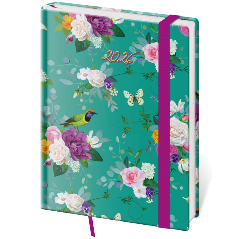Diář obsahuje: osobní údaje, plánovač dovolené (měsíční přehled), plánovací kalendář, mezinárodní svátky, roční výhled, týdenní layout, adresář